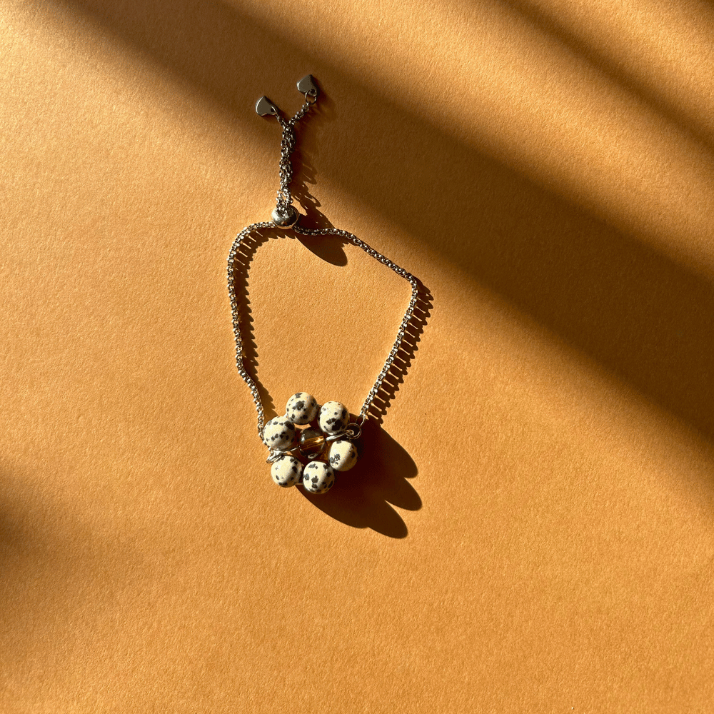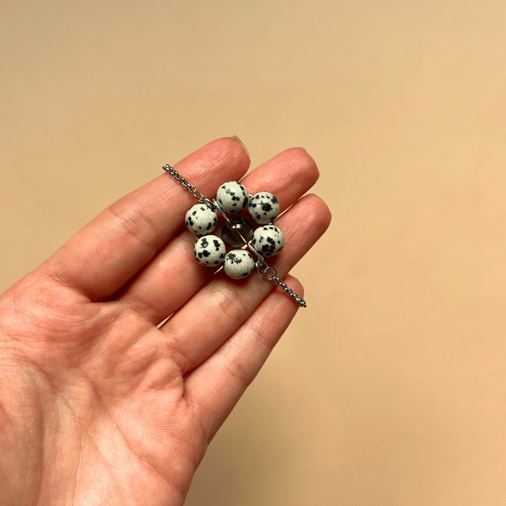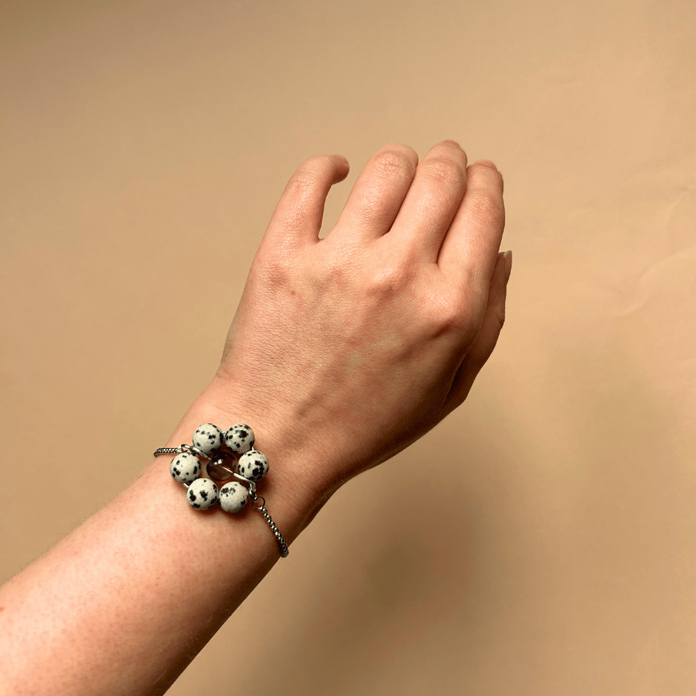 Subtelna bransoletka na zacisk, wykonana ze stali chirurgicznej, dzięki czemu jest trwała, lekka i idealna do noszenia na co dzień. Jej centrum zdobi ręcznie wykonany kwiatek z jaspisu z czekoladowym środkiem – naturalny, piękny akcent, który dodaje całości charakteru.