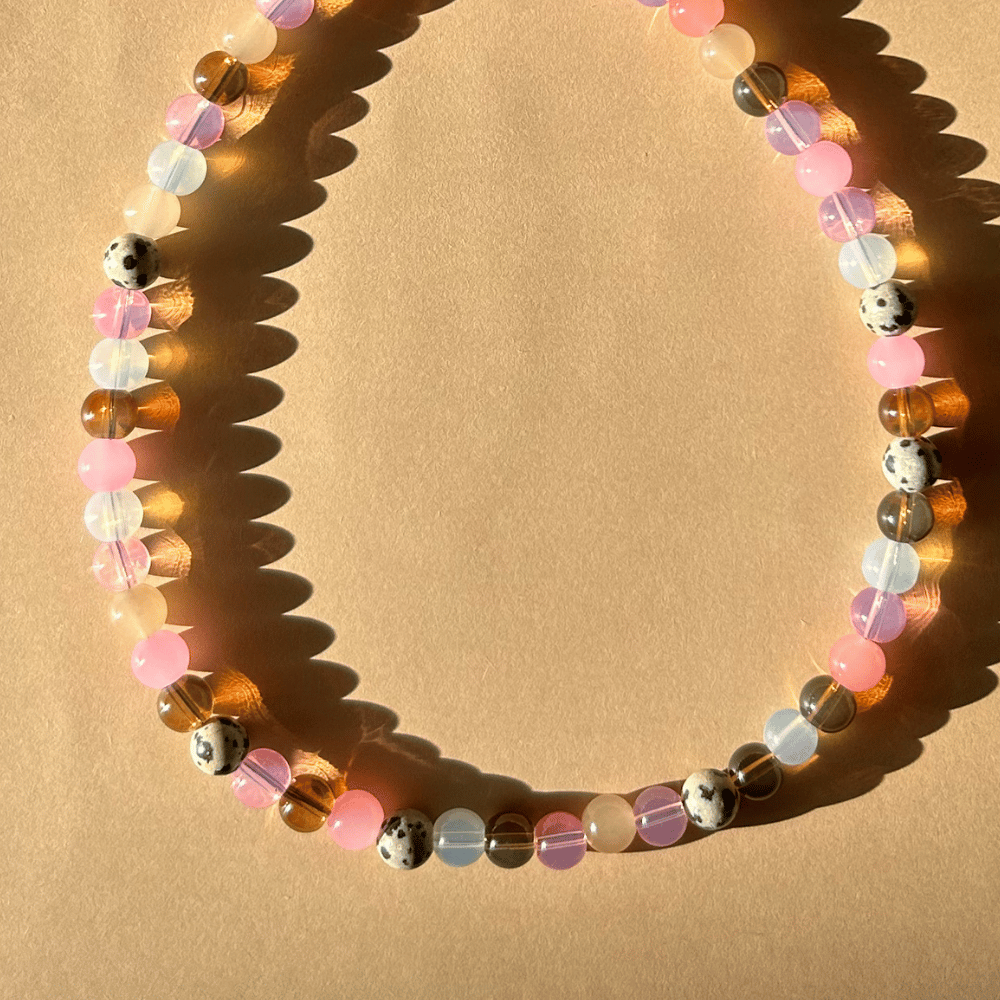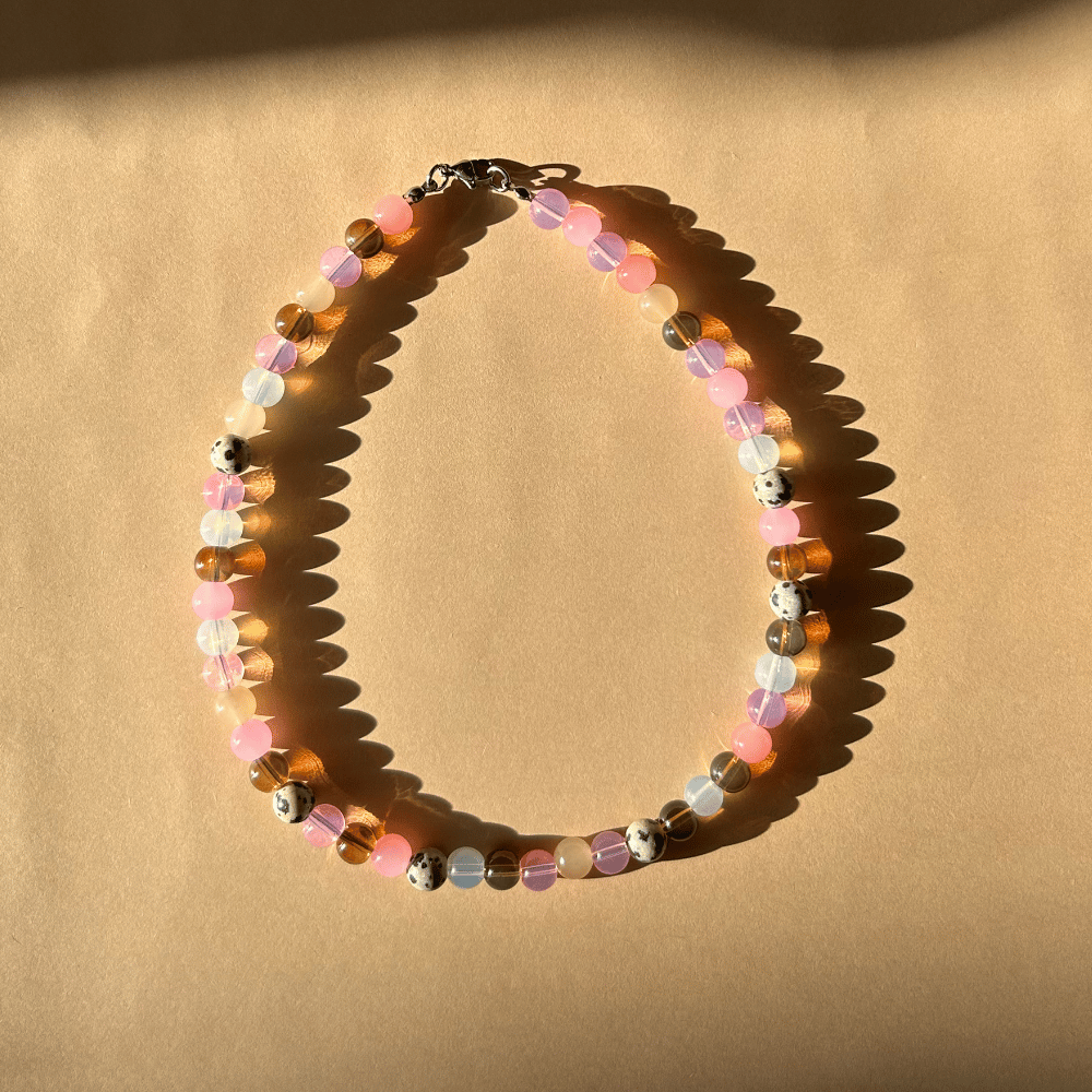 Delikatny naszyjnik z półtransparentnych koralików w odcieniach różu, bieli i brązu to harmonijne połączenie ciepłych barw z naturalnym akcentem. Dodatek jaspisu dalmatyńskiego (8 mm) nadaje mu wyjątkowego charakteru i lekko surowego uroku. Całość jest subtelna, kobieca i idealna na co dzień – pasuje zarówno do minimalistycznych, jak i bardziej wyrazistych stylizacji.
