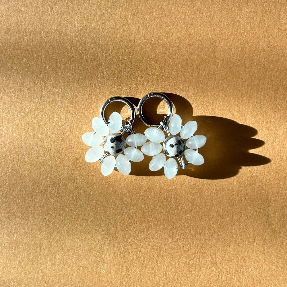 Kolczyki „Pleciony Kwiat” PASTELE szkło, stal, jaspis dalmatyński – srebrny (biel)