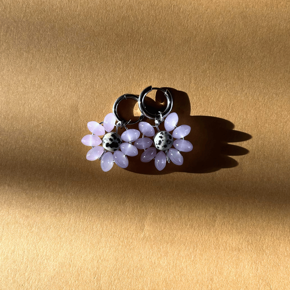 Kolczyki „Pleciony Kwiat” PASTELE szkło, stal, jaspis dalmatyński – srebrny (fiolet)