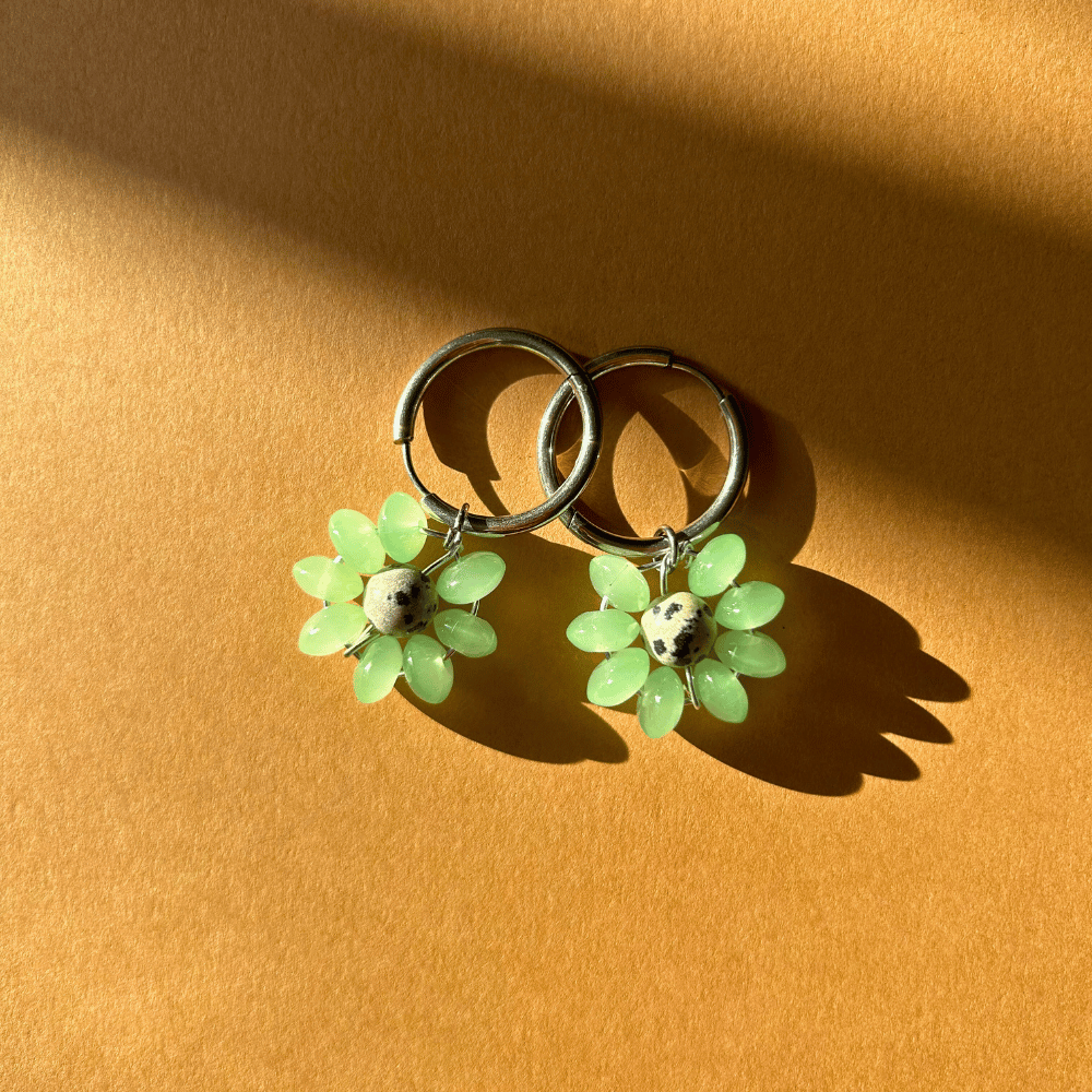 Kolczyki „Pleciony Kwiat” PASTELE szkło, stal, jaspis dalmatyński – srebrny (zielony)