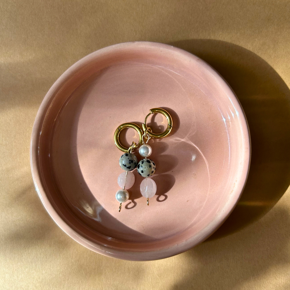 To połączenie bieli, czerni i różu sprawia, że kolczyki są romantyczne, ale z nutą nowoczesności. Idealne zarówno do codziennych stylizacji, jak i jako subtelne dopełnienie bardziej eleganckiego looku.