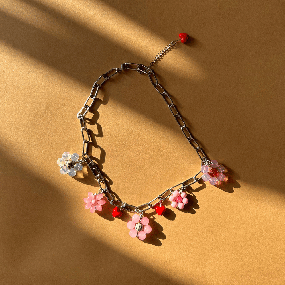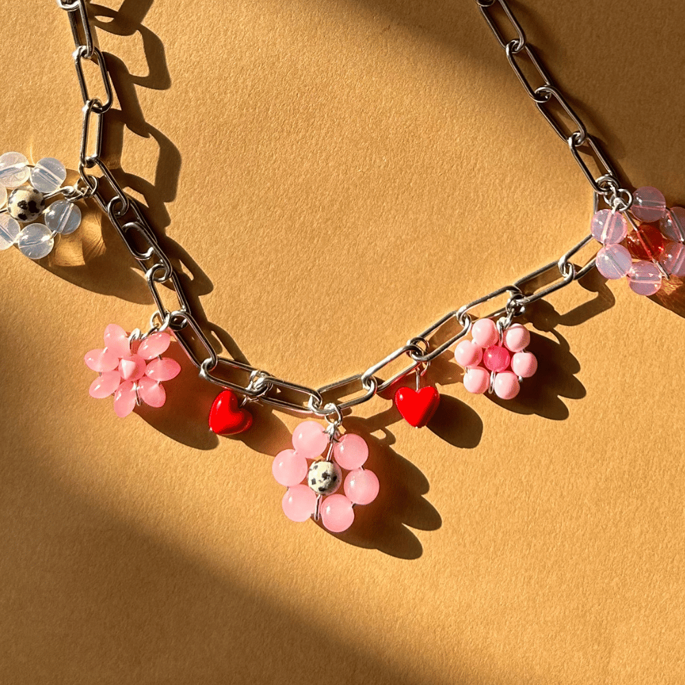 Walentynkowa wersja łańcuszka pełnego miłości ❤ Łańcuch ze stali chirurgicznej, ozdobiony czterema ręcznie plecionymi kwiatkami ze szkła. Kolory – różowy, brzoskwiniowy, transparentny i dodatek jaspisu – tworzą ciepłą, subtelną kompozycję, idealną na co dzień i do warstwowych stylizacji. Całość dopełniają czerwone serduszka, które dodaje lekkości i eleganckiego akcentu.