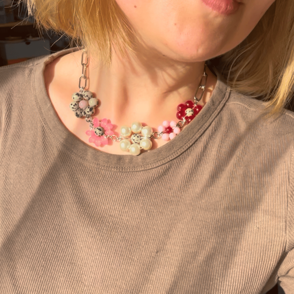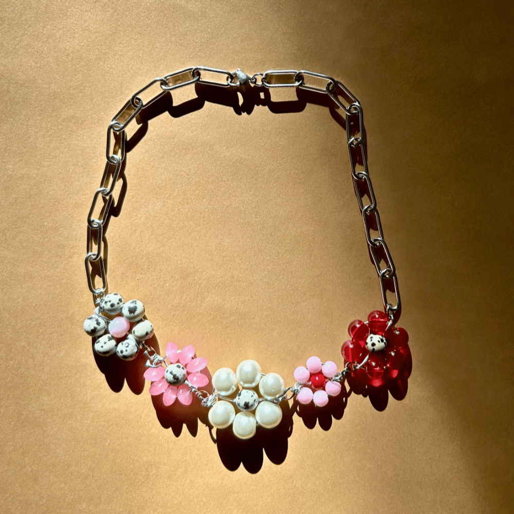 Wyjątkowy łańcuch, w którym pięć ręcznie plecionych kwiatków zostało wplecionych bezpośrednio w strukturę łańcucha, zamiast swobodnie zwisać. Dzięki temu całość tworzy spójną, dopracowaną kompozycję i pięknie układa się na szyi.