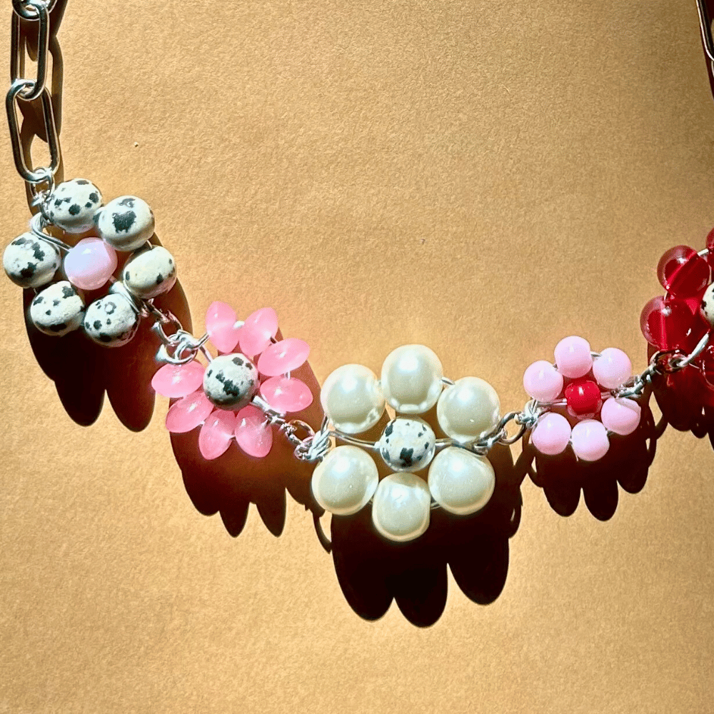 Łańcuch z ręcznie plecionymi kwiatkami – różowo-czerwony z jaspisem