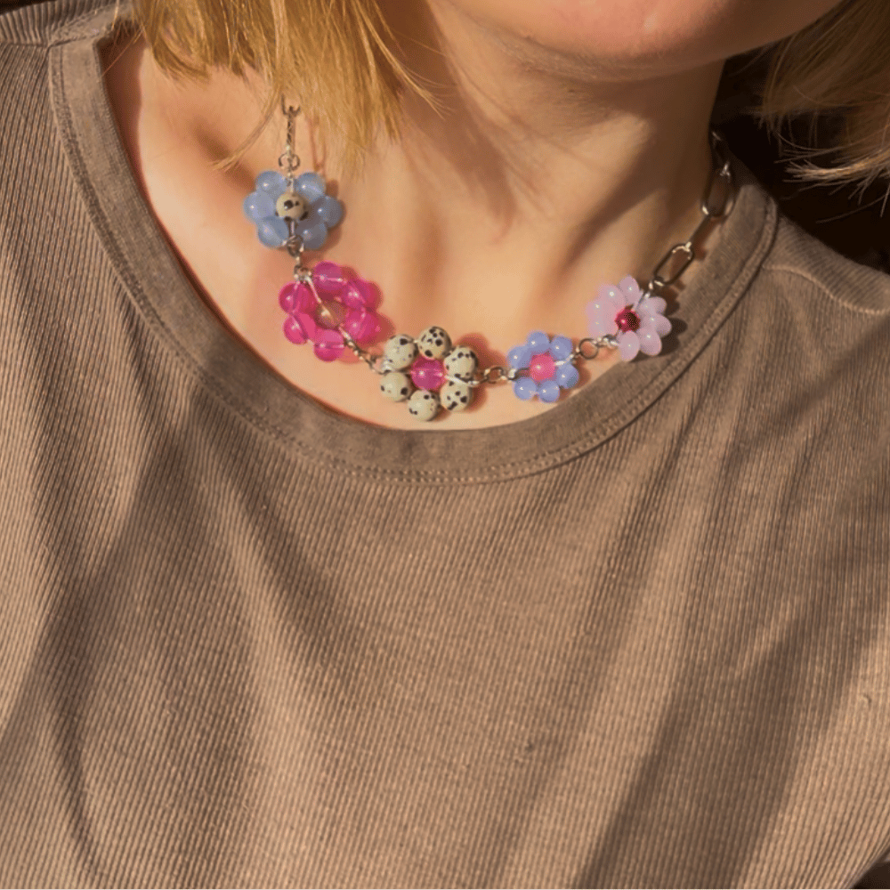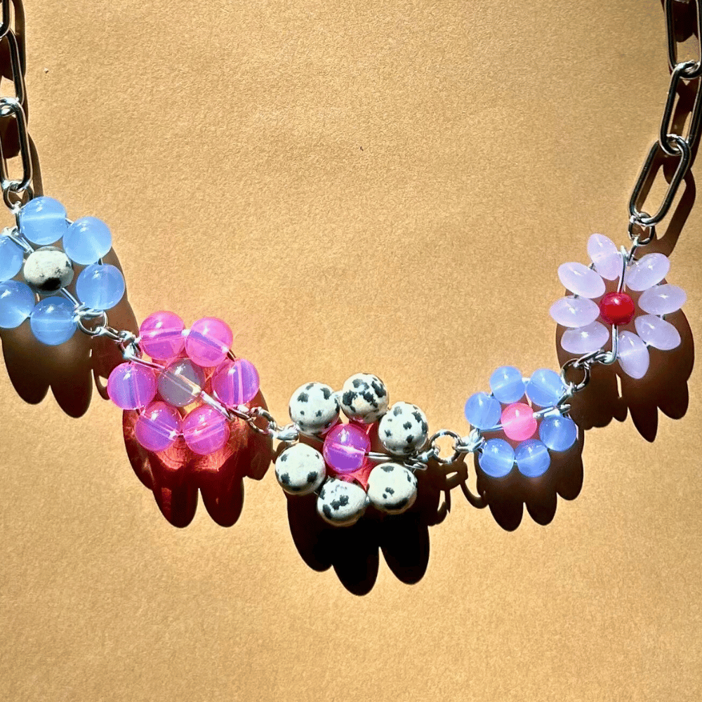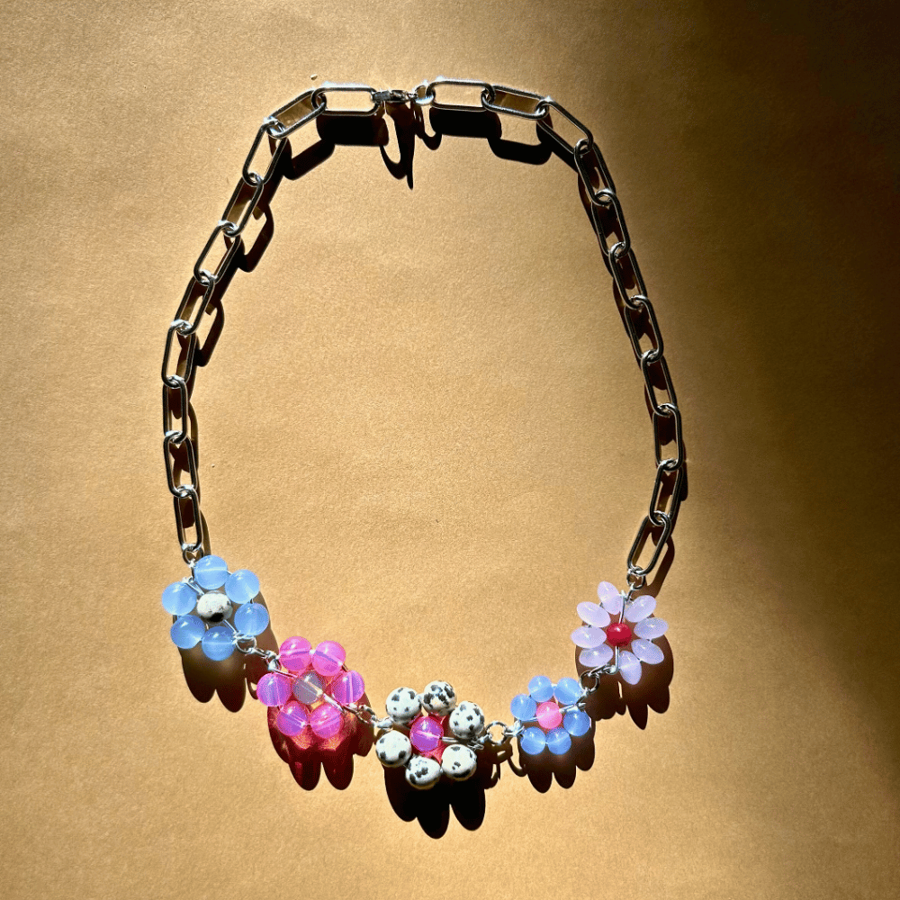 Łańcuch z ręcznie plecionymi kwiatkami – różowo-niebieski z jaspisem