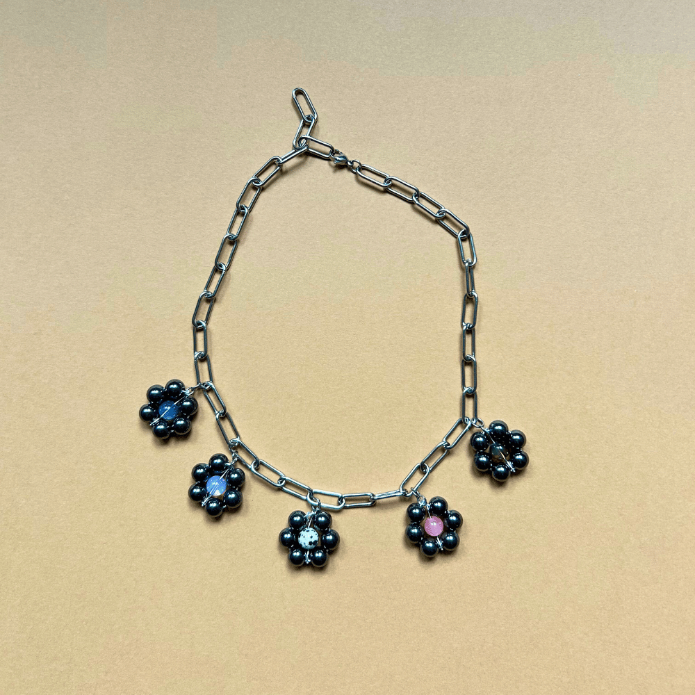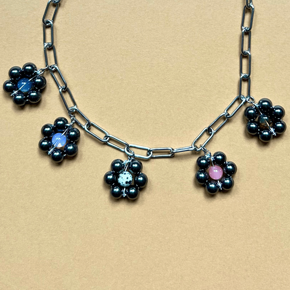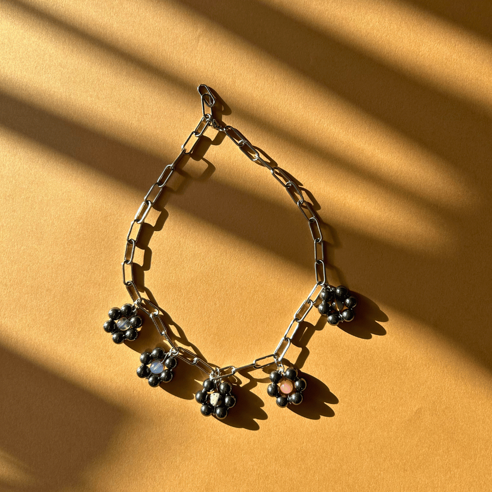 Wyjątkowy, charakterystyczny naszyjnik stworzony z myślą o osobach, które kochają subtelne, ale wyraziste dodatki. Pięć ręcznie plecionych kwiatków z hematytu tworzy elegancki, ciemniejszy akcent, który pięknie uzupełni delikatne, kolorowe kompozycje lub sprawdzi się jako samodzielna biżuteria.