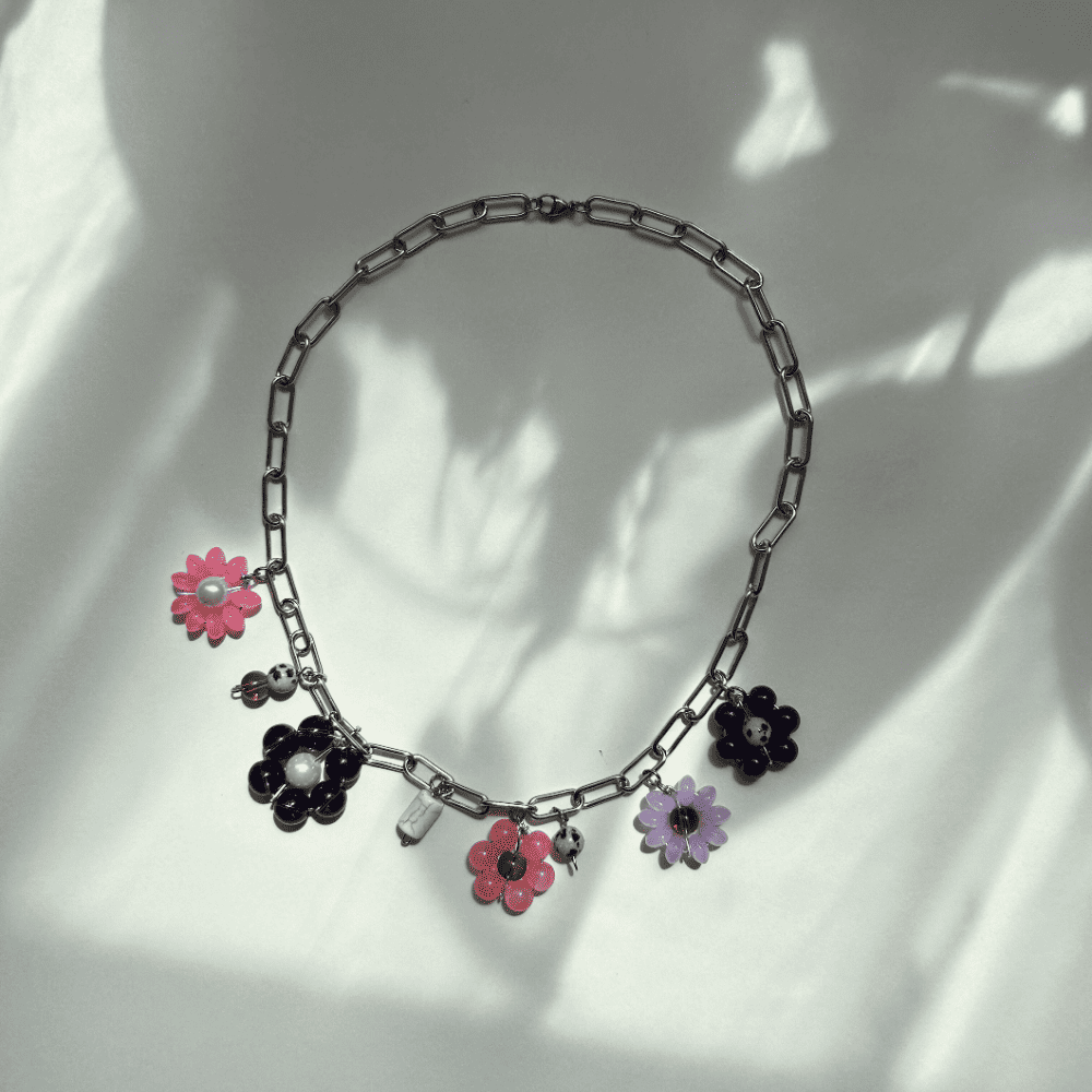Wyjątkowy łańcuch z ręcznie robionymi zawieszkami, który przyciąga uwagę swoją formą i doborem kolorów. Stworzony z trwałej stali chirurgicznej, szkła oraz jaspisu dalmatyńskiego, łączy w sobie surowość kamieni i delikatność szkła w harmonijny, przemyślany sposób.