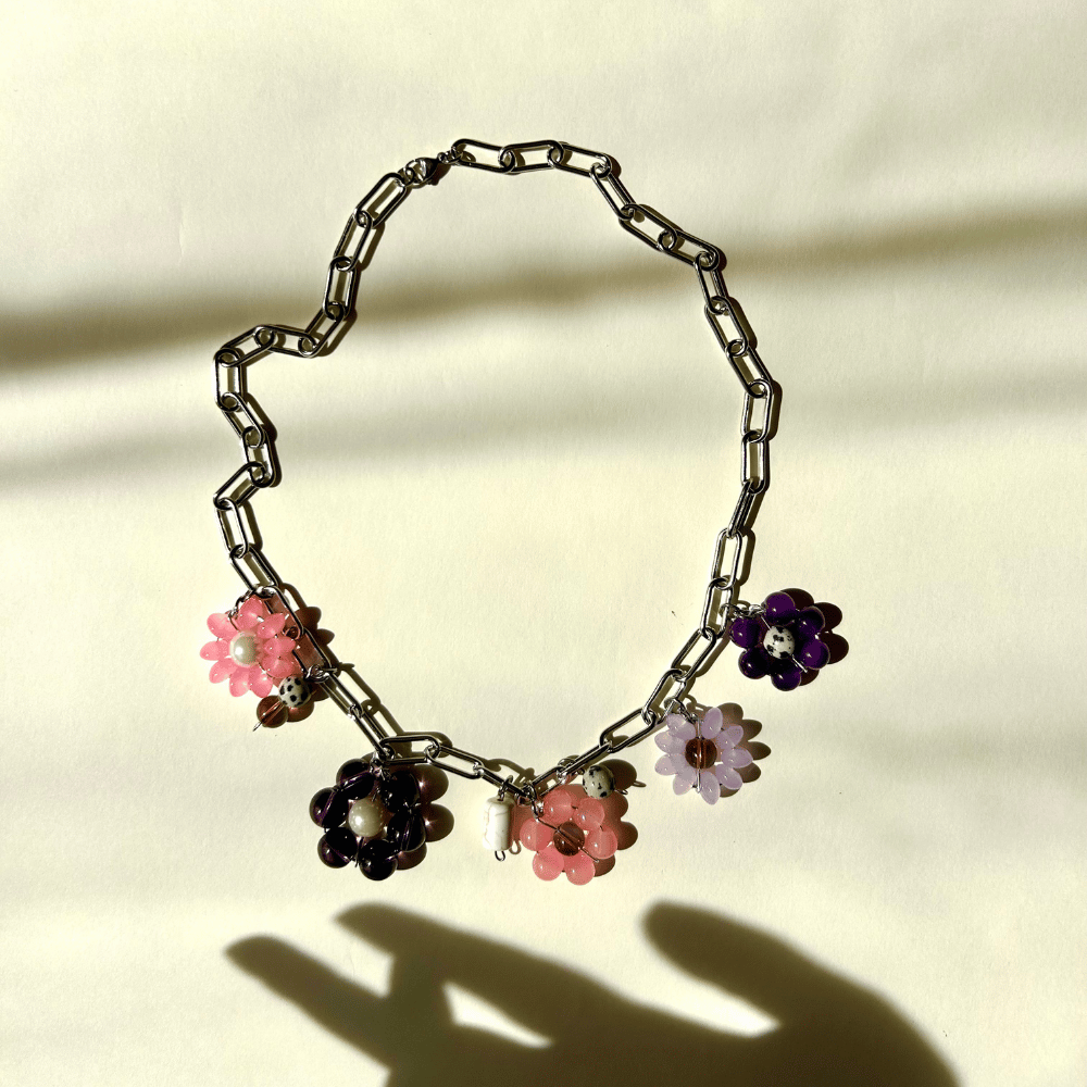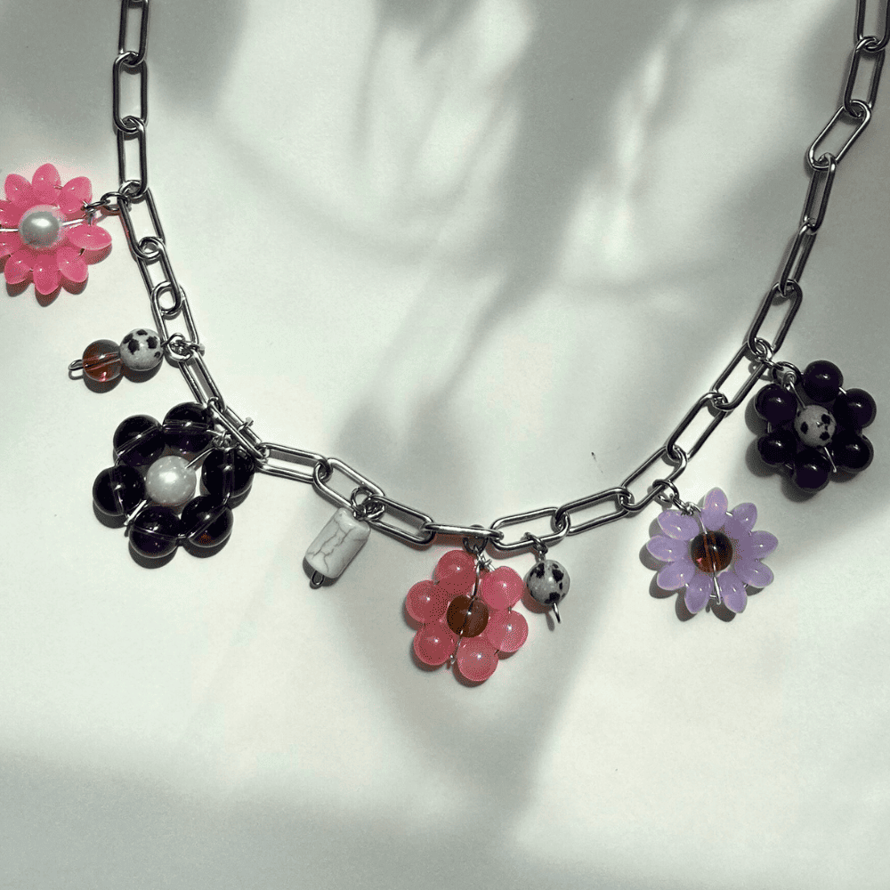 Łańcuch z zawieszkami – kwiaty, jaspis, szkło, howlit – fiolet, róż