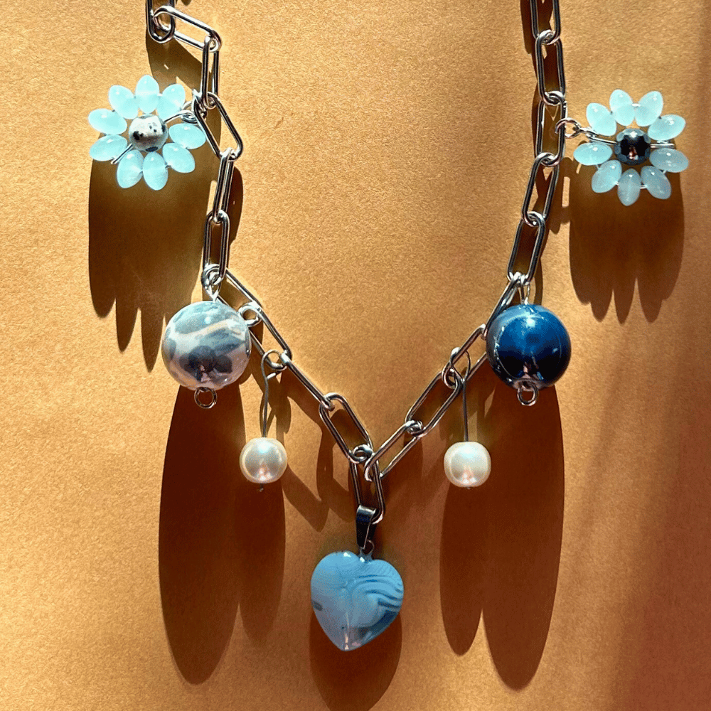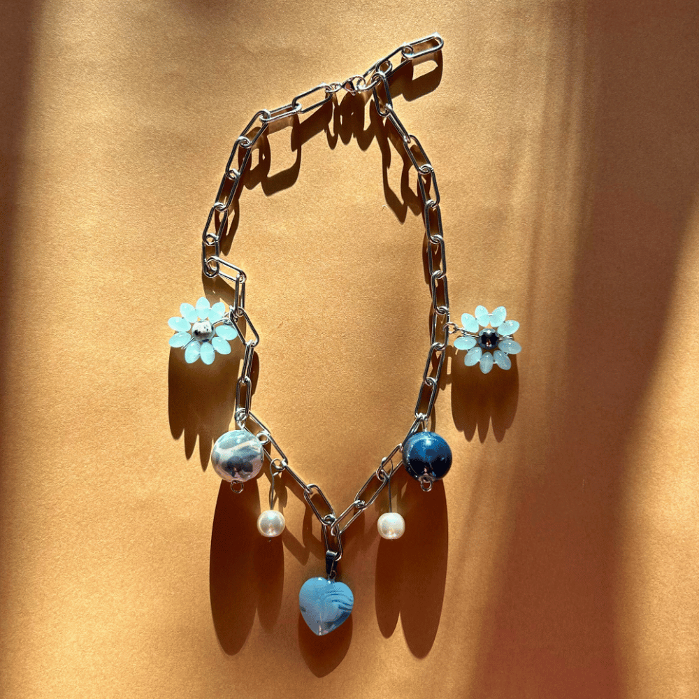 Wyrazisty, a jednocześnie subtelny łańcuch wykonany ze stali chirurgicznej, utrzymany w eleganckich odcieniach błękitu i granatu. Całość wzbogacają ręcznie plecione kwiatki, elementy z ceramiki, hematytu oraz jaspisu dalmatyńskiego, które nadają kompozycji głębi i unikatowego charakteru.