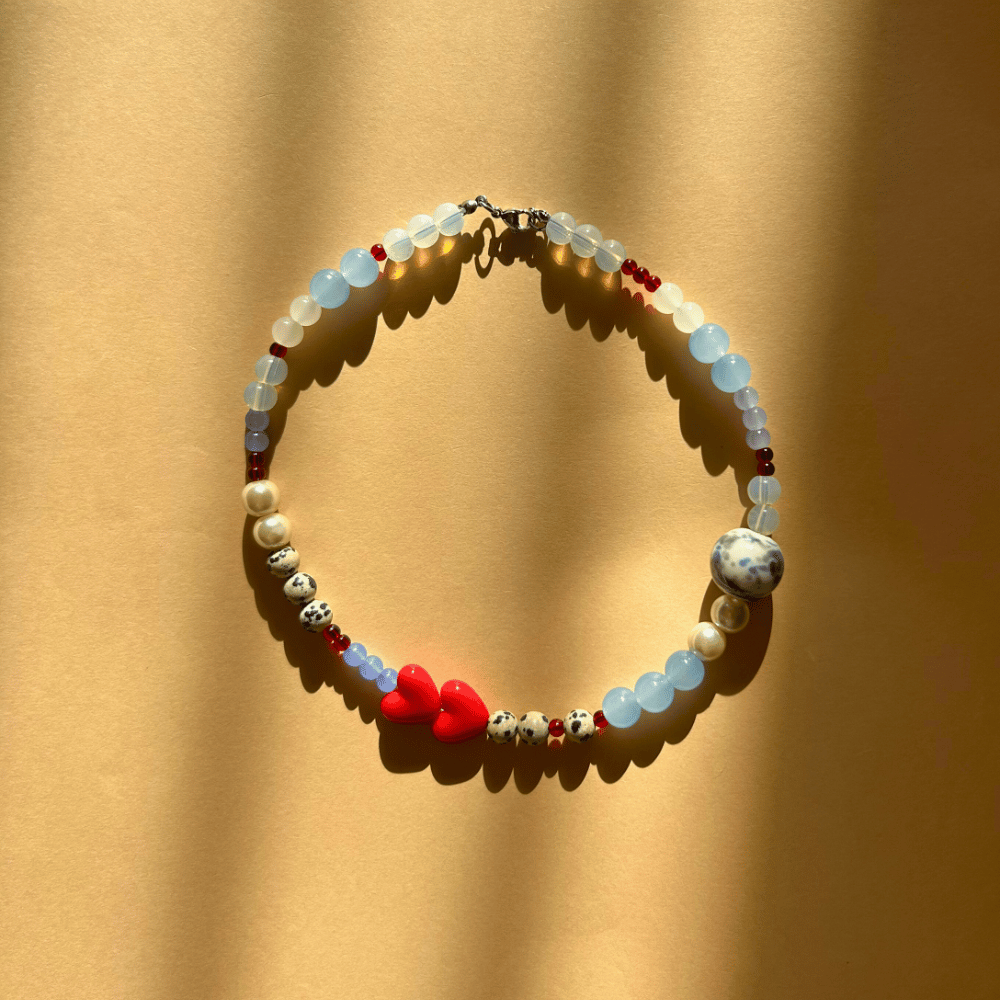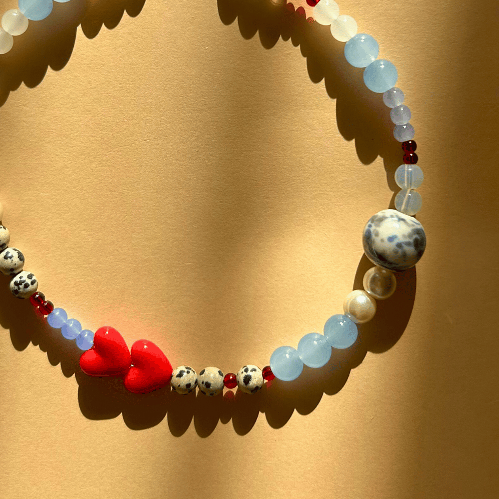 Naszyjnik dalmatyńczyk niebieski z serduszkami i ceramiką