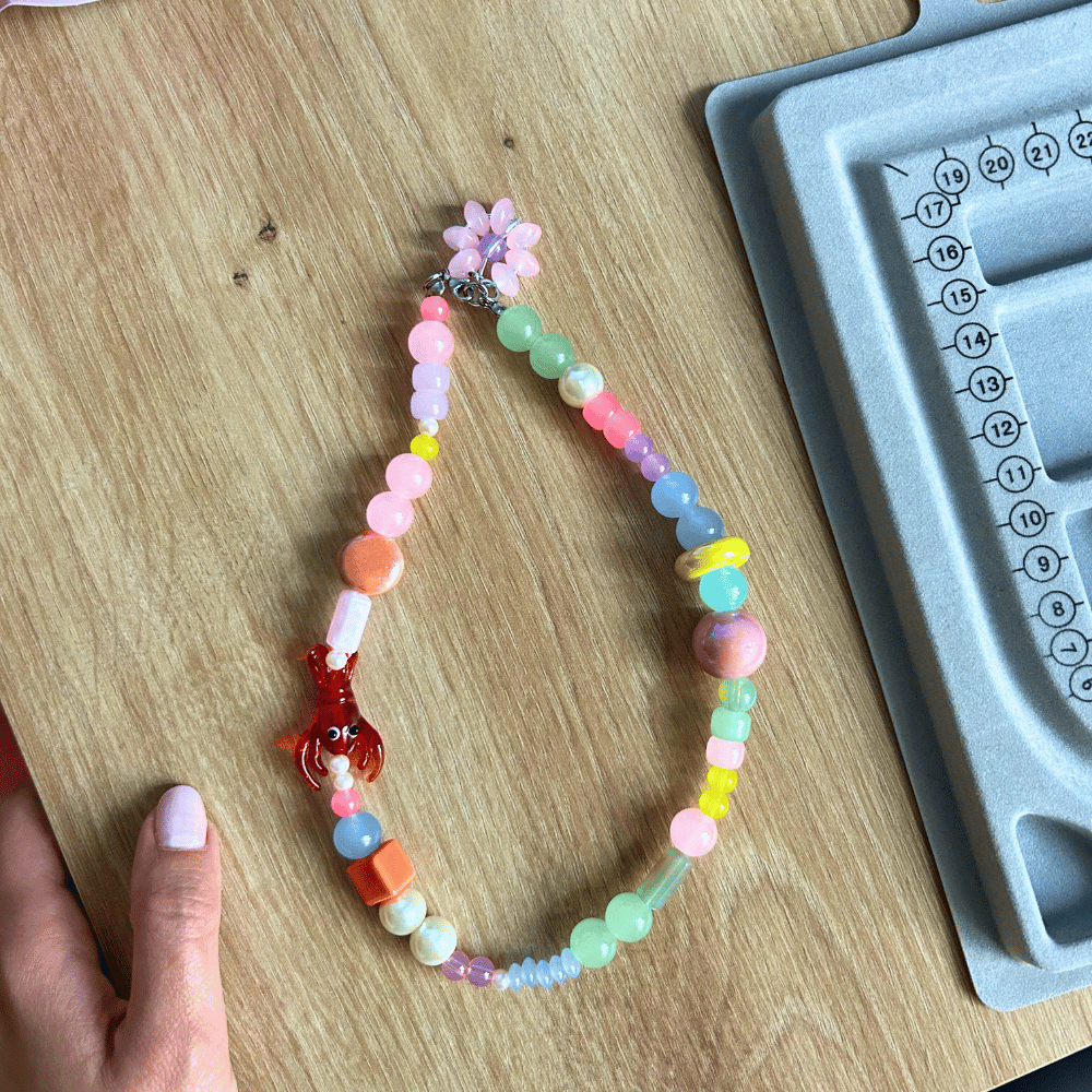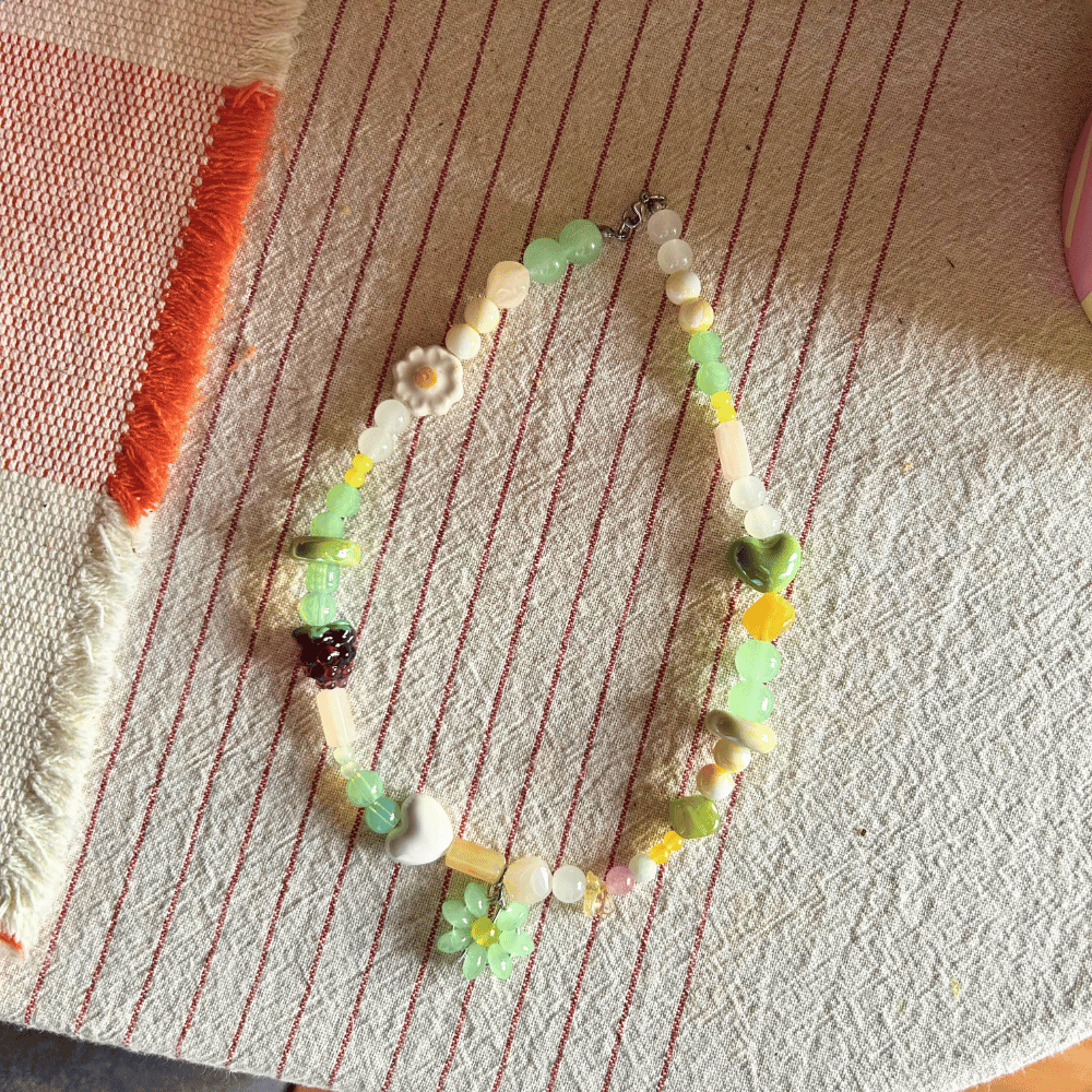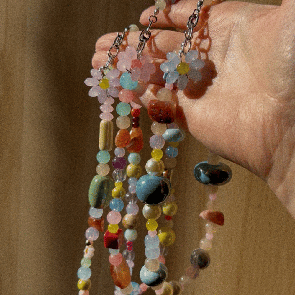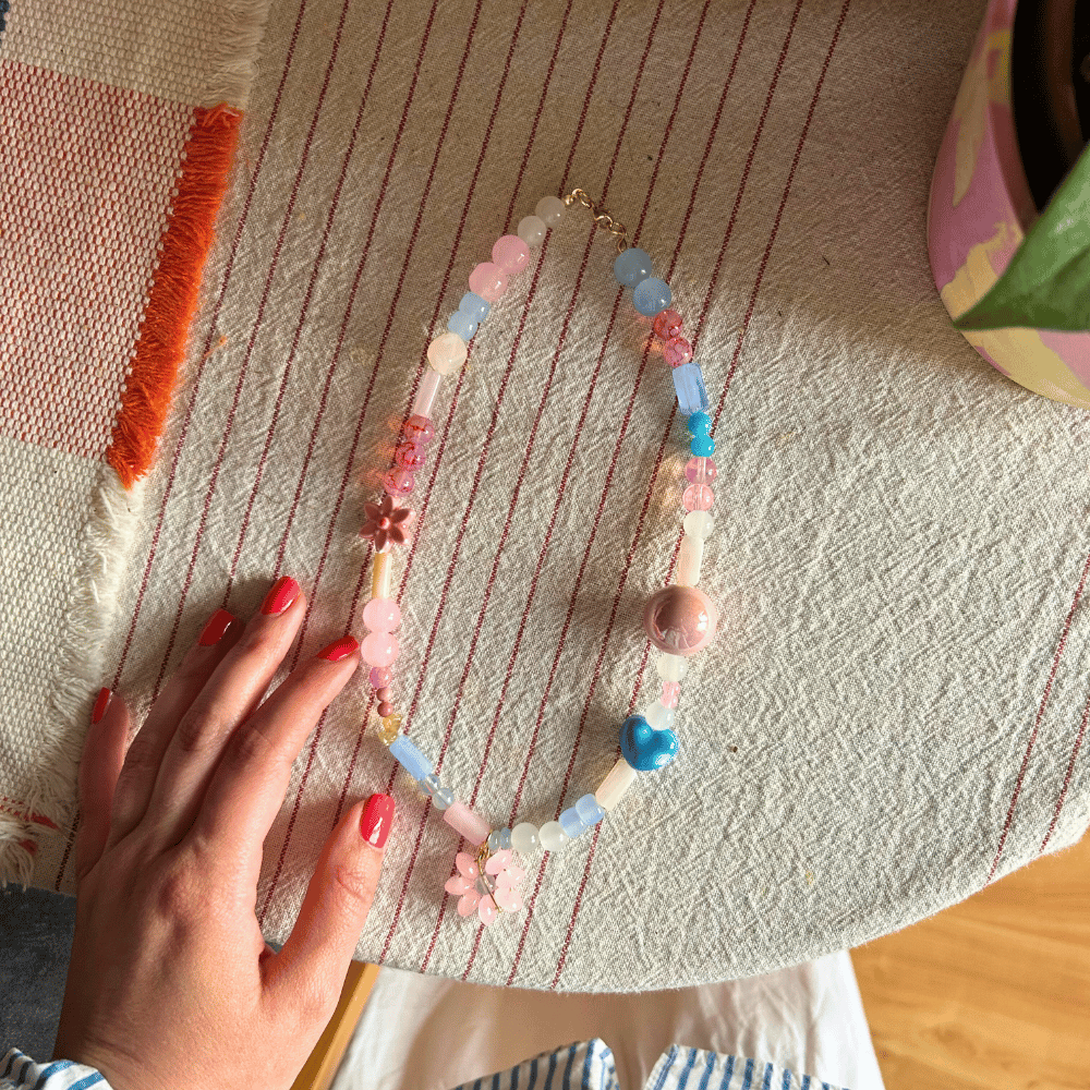 Każdy naszyjnik z kolekcji Niezapominajka to unikatowe, ręcznie tworzone dzieło sztuki. Nie ma dwóch identycznych egzemplarzy – każdy jest wyjątkowy i niepowtarzalny. Połączenie kamieni naturalnych, szkła i ceramiki tworzy harmonijną kompozycję pełną subtelności i charakteru. Całość zwieńcza delikatne zapięcie ze stali chirurgicznej, a wyjątkowy akcent stanowi ręcznie pleciony kwiatek, który nadaje biżuterii lekkości i romantycznego uroku.