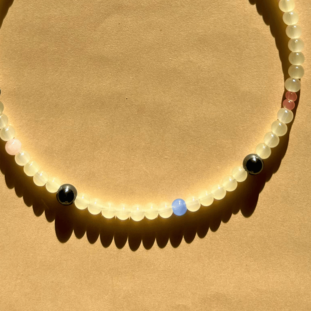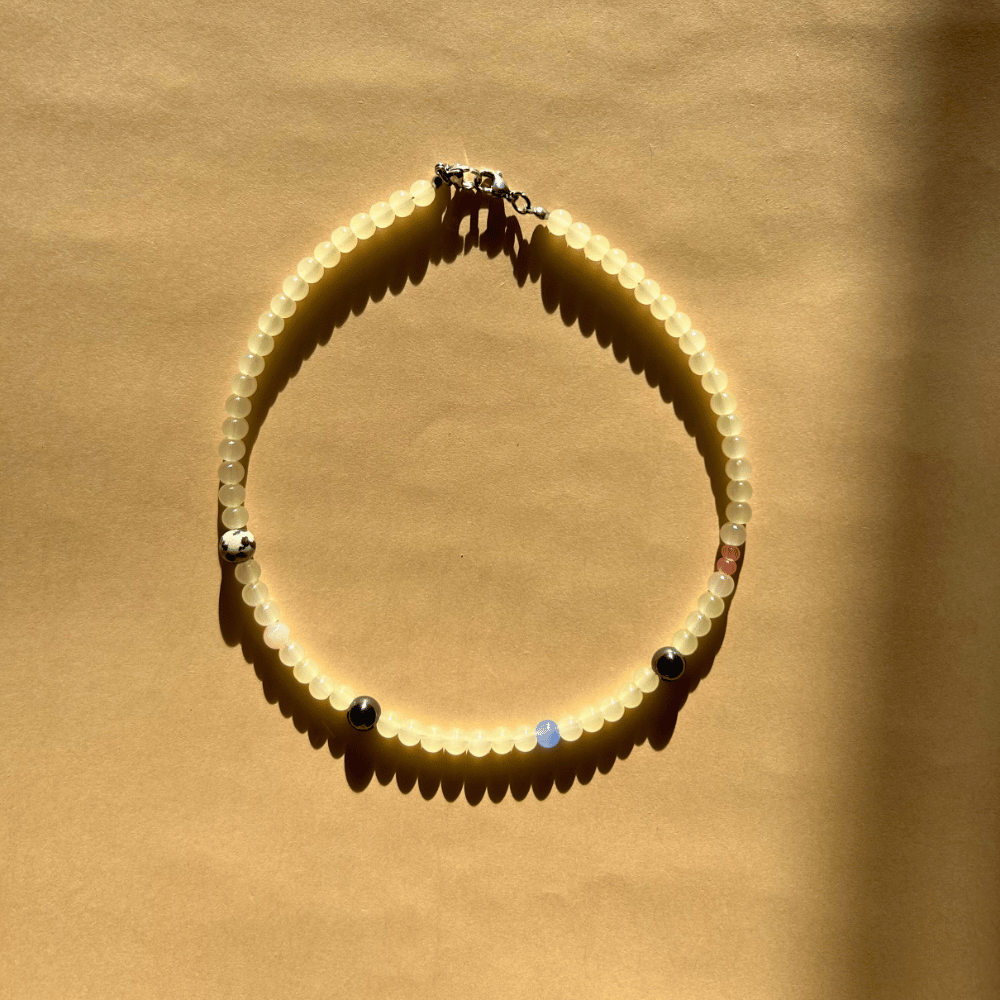 Delikatny, pełen blasku naszyjnik wykonany ze szkła, stali szlachetnej, jaspisu i hematytu. Bazę stanowią subtelne żółte szklane koraliki, które dodają całości lekkości i ciepła.