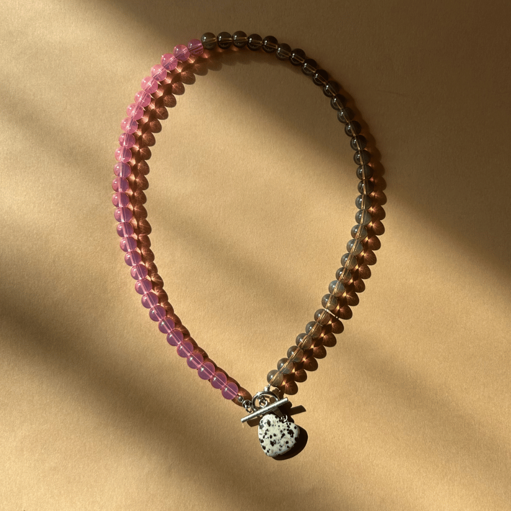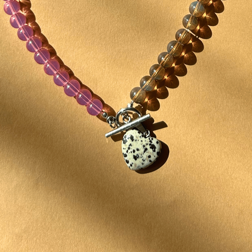 Centralnym punktem kompozycji jest serce z jaspisu dalmatyńskiego, które dodaje charakteru i pięknie kontrastuje z ciepłą, pastelową bazą. Całość zapinana jest z przodu na zapięcie typu toggle ze stali chirurgicznej, które stanowi zarówno praktyczny, jak i dekoracyjny element.