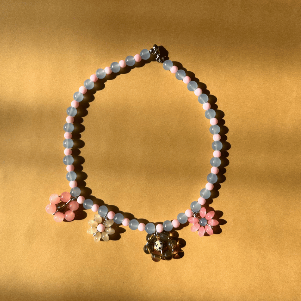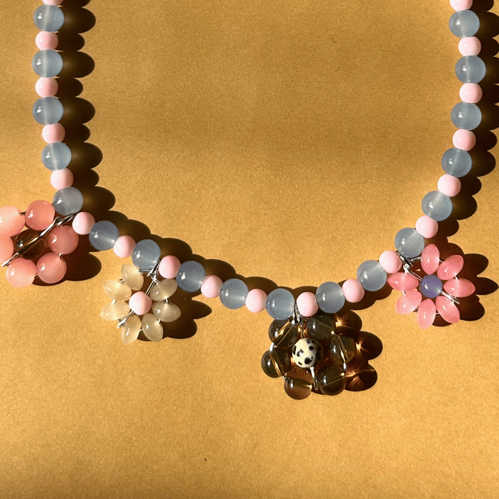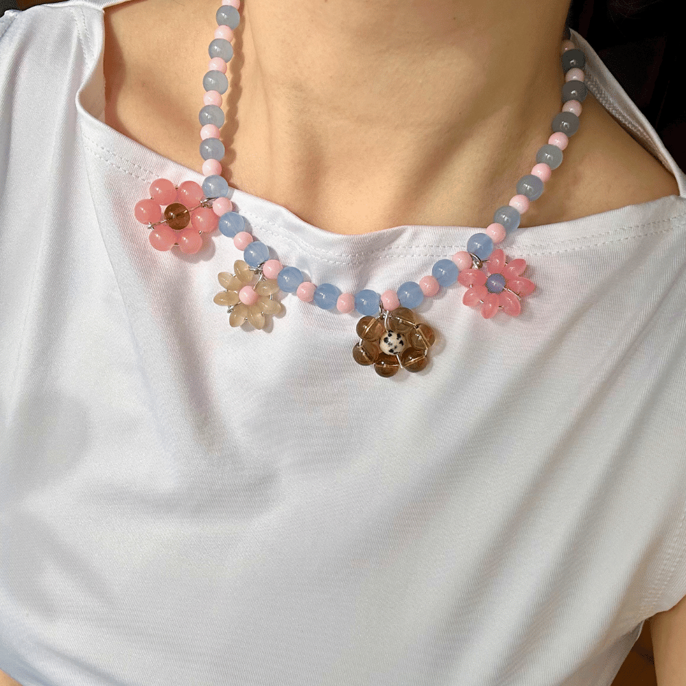 Ozdobą naszyjnika są cztery ręcznie plecione kwiatki, wykonane ze szkła (6 mm i 8 mm) z dodatkiem jaspisu, które wprowadzają unikatowy, rękodzielniczy detal i przyciągają uwagę.