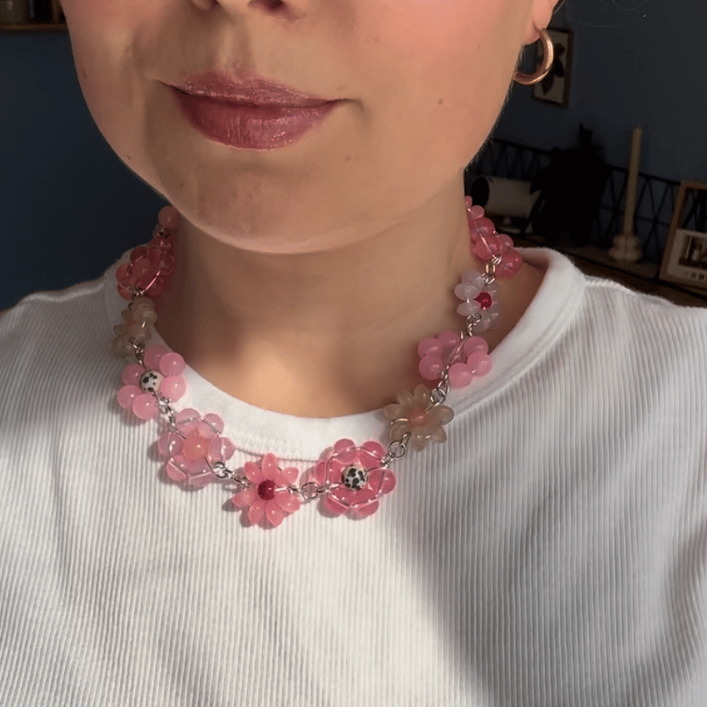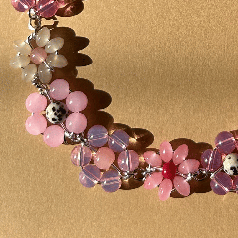 Wyjątkowy naszyjnik w całości wykonany z ręcznie plecionych kwiatków, stworzonych ze stali, szkła oraz jaspisu dalmatyńskiego. To pracochłonny, biżuteryjny projekt, który zachwyca fakturą, rytmem i detalem. Każdy kwiatek powstaje ręcznie, dlatego nie ma dwóch identycznych egzemplarzy.