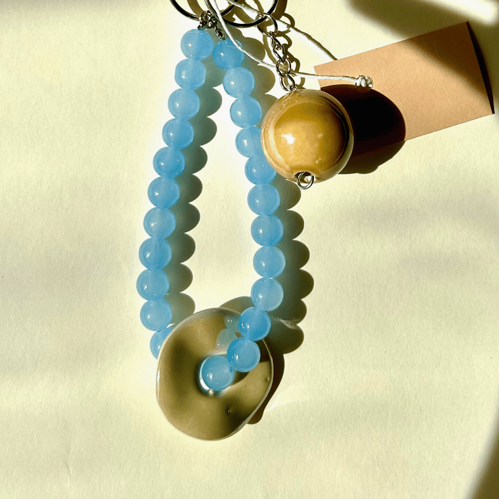 Zawieszka do torby lub kluczy wykonana z ręcznie nawlekanych szklanych koralików (10 mm) i ceramicznych elementów, które tworzą oryginalne, artystyczne połączenie faktur i kolorów. Całość wykończona elementami ze stali chirurgicznej, dzięki czemu jest trwała i odporna na zarysowania.