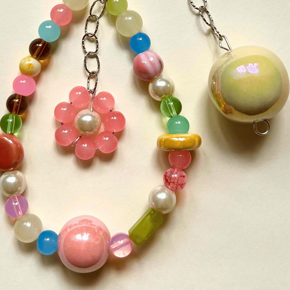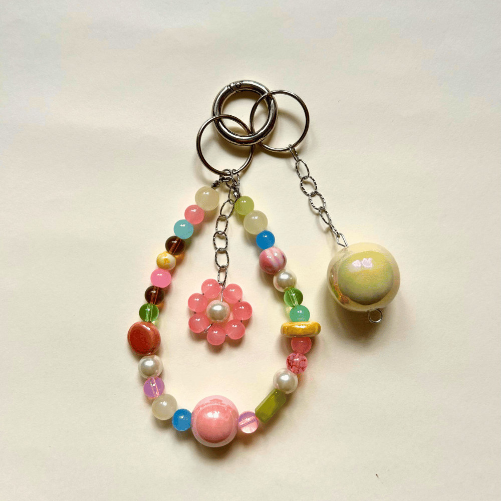 Zawieszka do torby lub kluczy wykonana z ręcznie nawlekanych szklanych koralików (10 mm) i ceramicznych elementów, które tworzą oryginalne, artystyczne połączenie faktur i kolorów. Całość wykończona elementami ze stali chirurgicznej, dzięki czemu jest trwała i odporna na zarysowania.