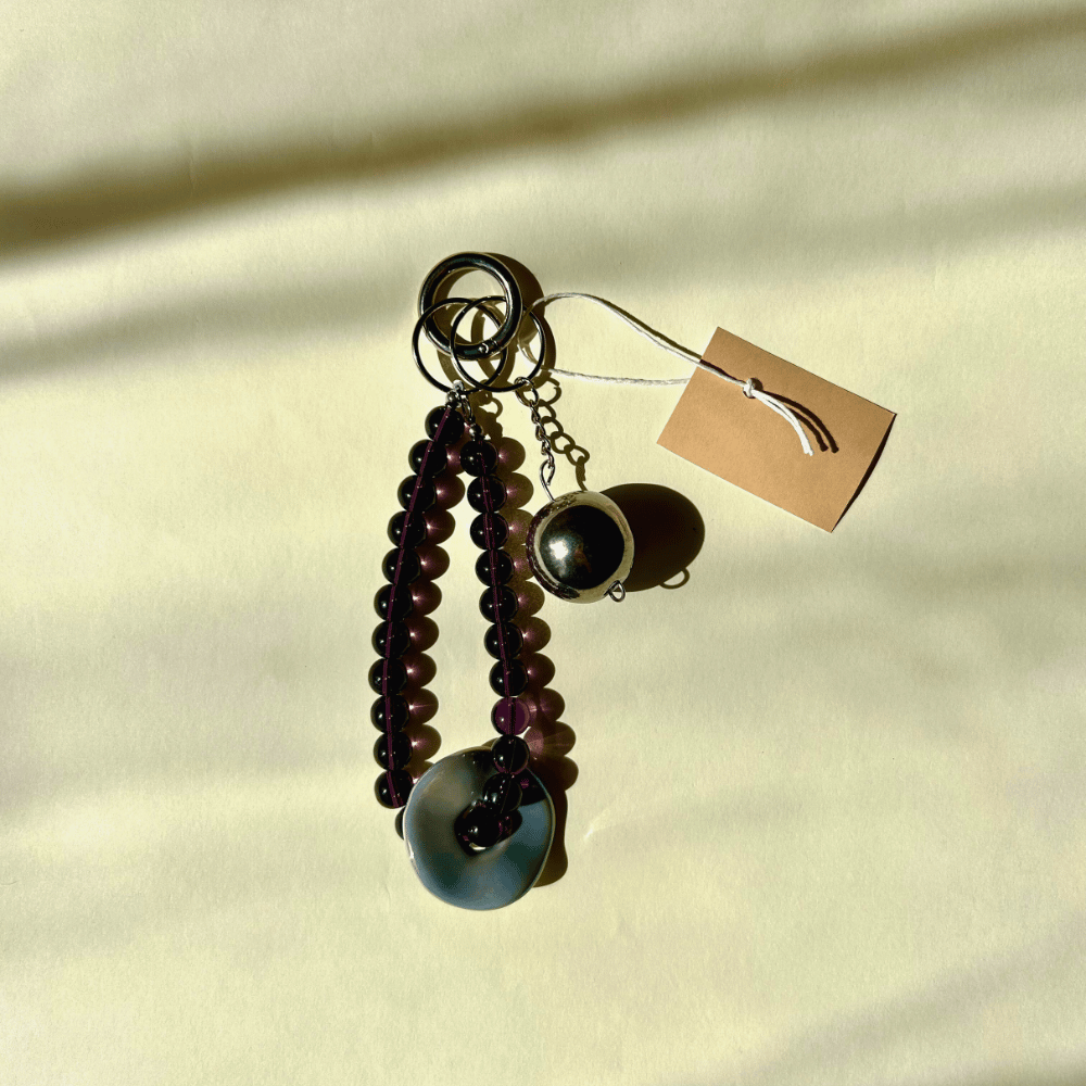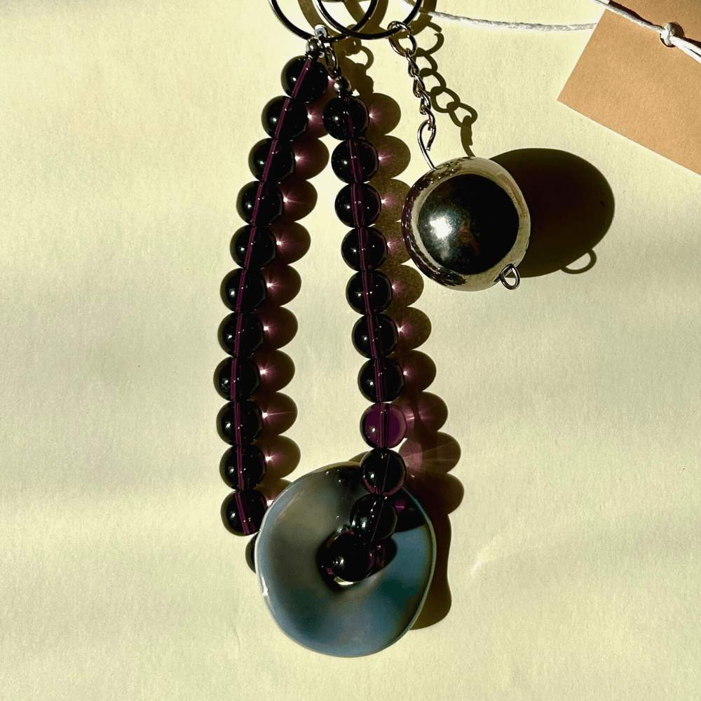 Zawieszka do torby lub kluczy wykonana z ręcznie nawlekanych szklanych koralików (10 mm) i ceramicznych elementów, które tworzą oryginalne, artystyczne połączenie faktur i kolorów. Całość wykończona elementami ze stali chirurgicznej, dzięki czemu jest trwała i odporna na zarysowania.