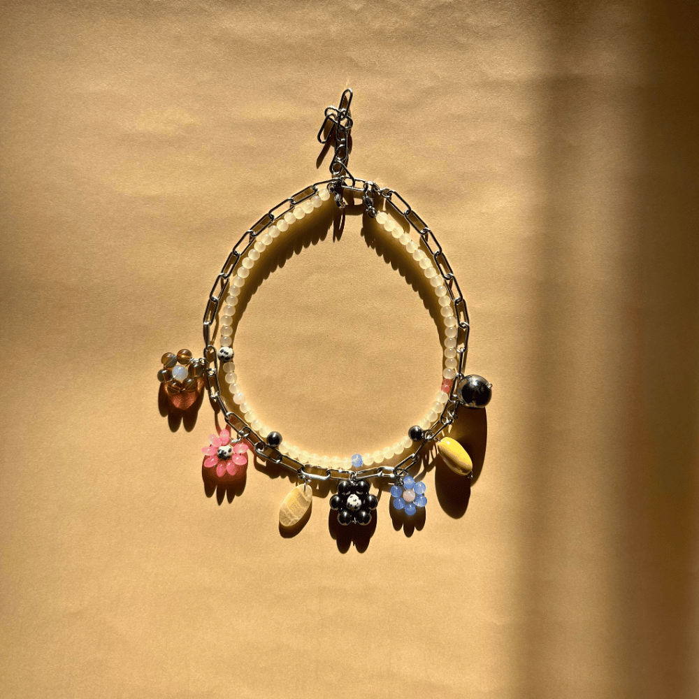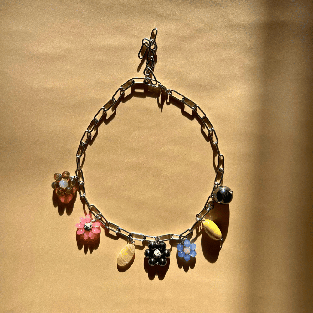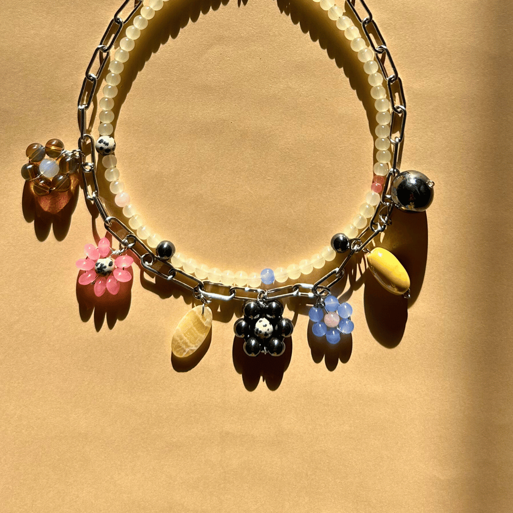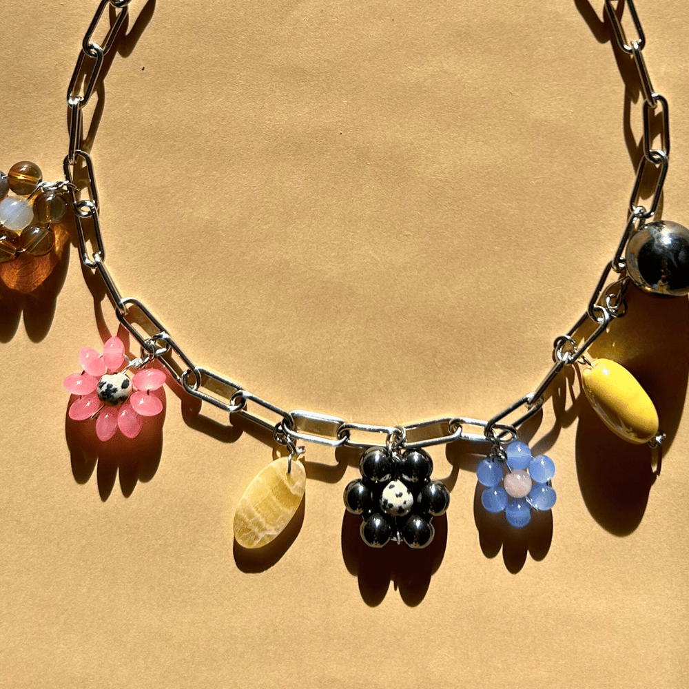 🌸 Łańcuch – ze stali szlachetnej, zdobiony ręcznie robionymi kwiatkami ze szkła, jaspisem dalmatyńskim, żółtym aragonitem, hematytem i ceramiką. Każdy egzemplarz jest niepowtarzalny, subtelnie różniący się detalami.