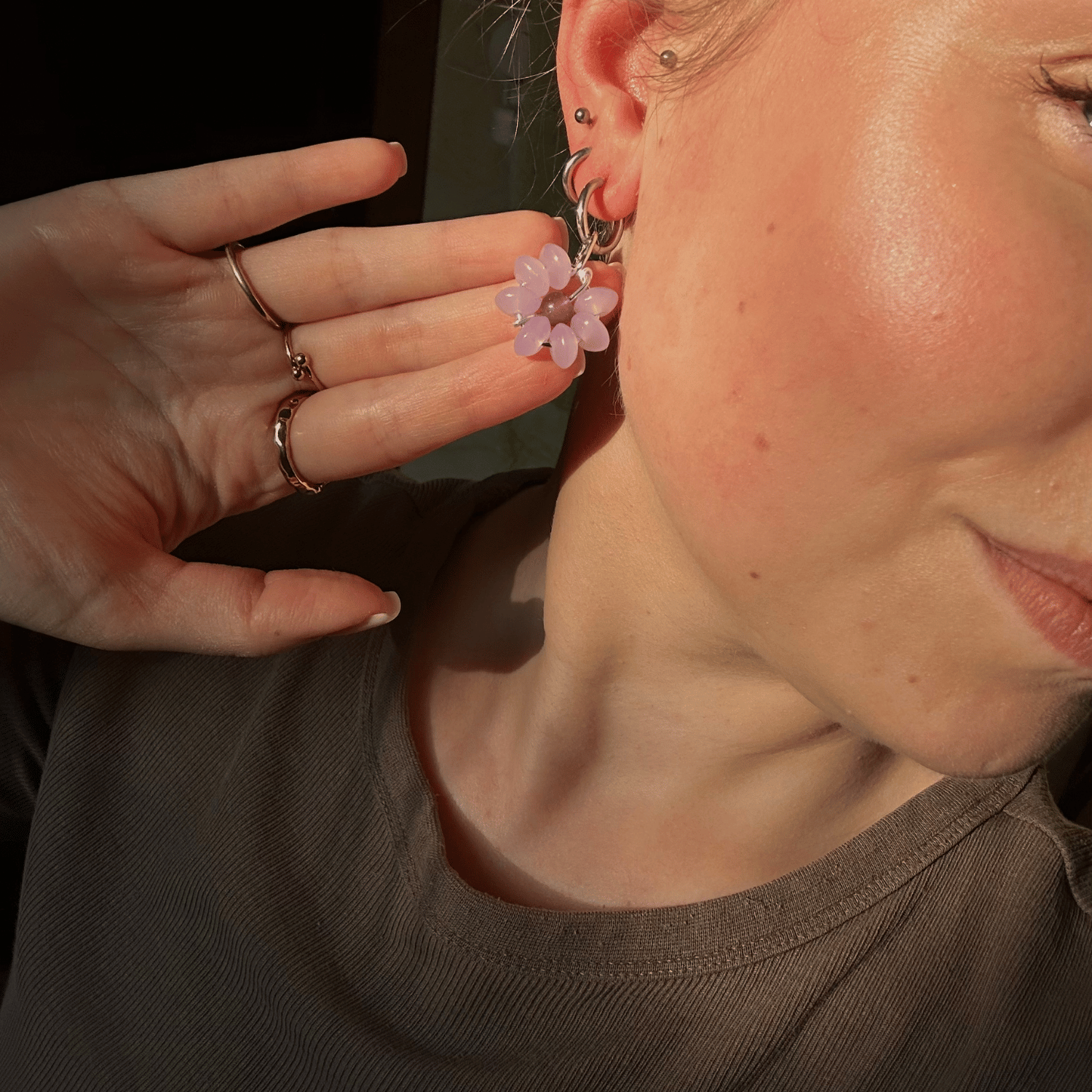 Kolczyki „Pleciony Kwiat” to wyjątkowe połączenie delikatności i rzemiosła. Każdy kwiatek jest ręcznie pleciony ze szkła, tworząc subtelną, lekką formę, która pięknie odbija światło i dodaje uroku każdej stylizacji. Kolczyki zawieszone są na stalowych kółkach, a całość uzupełnia stalowy drut, który zapewnia trwałość i komfort noszenia.