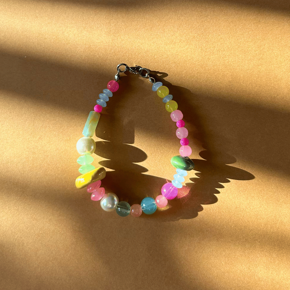 Subtelna, lekka i pełna delikatnych kolorów pastelowa bransoletka wykonana z mieszanki szklanych oraz ceramicznych koralików. To idealny dodatek dla osób, które kochają miękkie, harmonijne odcienie i biżuterię, która dodaje stylizacji odrobiny słodyczy i lekkości.