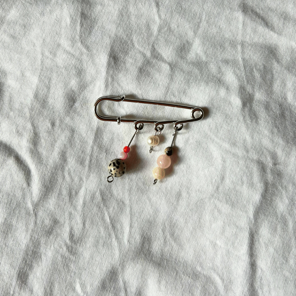 Broszka ze stali chirurgicznej, wykonana z trzech ręcznie robionych elementów – każda z nich jest jedyna w swoim rodzaju i dostępna wyłącznie w jednej sztuce. W kompozycji znajdziesz kamienie naturalne, perły oraz jaspis, które dodają jej charakteru i wyjątkowej formy.