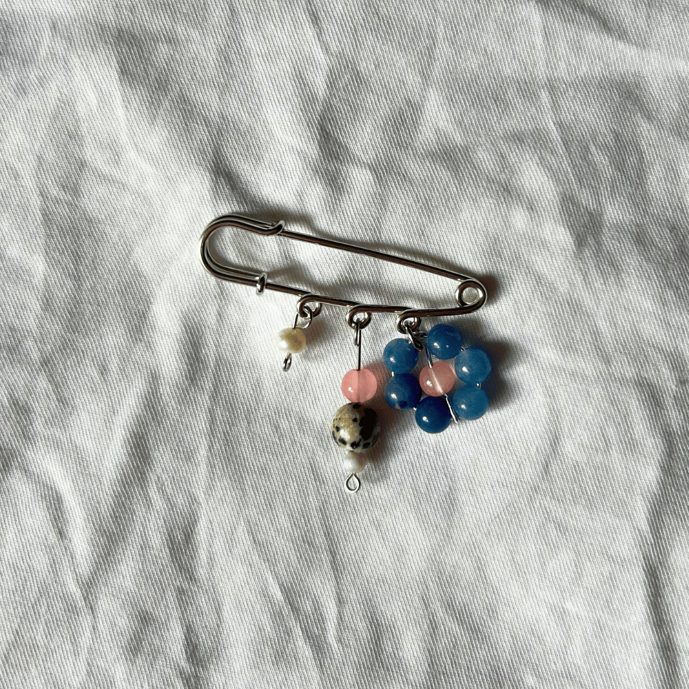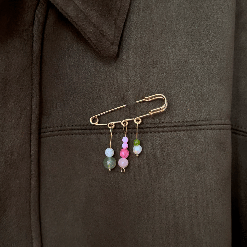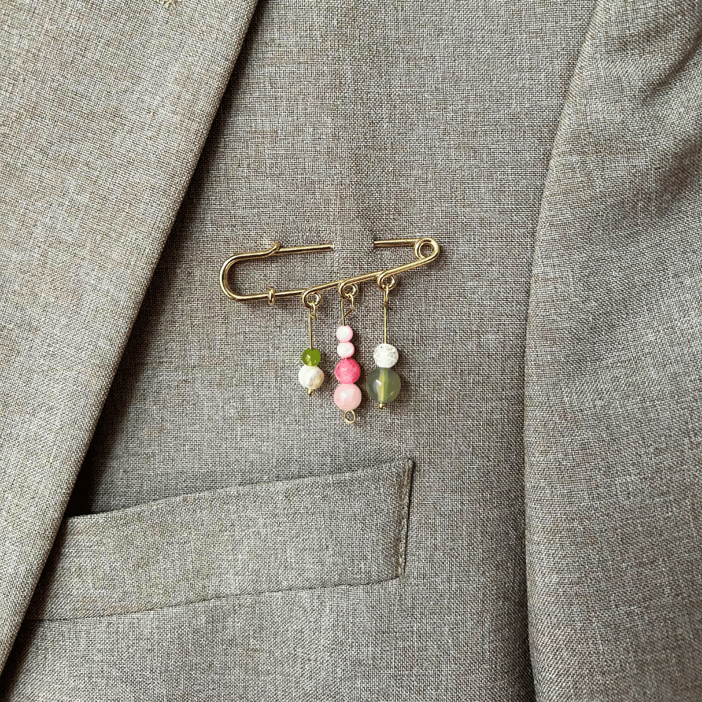 Broszka ze stali chirurgicznej, wykonana z trzech ręcznie robionych elementów – każda z nich jest jedyna w swoim rodzaju i dostępna wyłącznie w jednej sztuce. W kompozycji znajdziesz kamienie naturalne, perły oraz jaspis, które dodają jej charakteru i wyjątkowej formy.