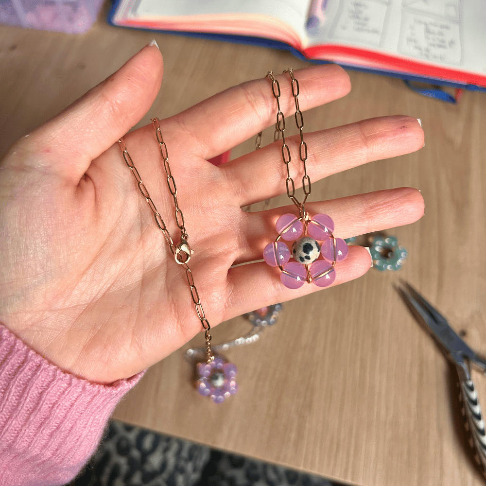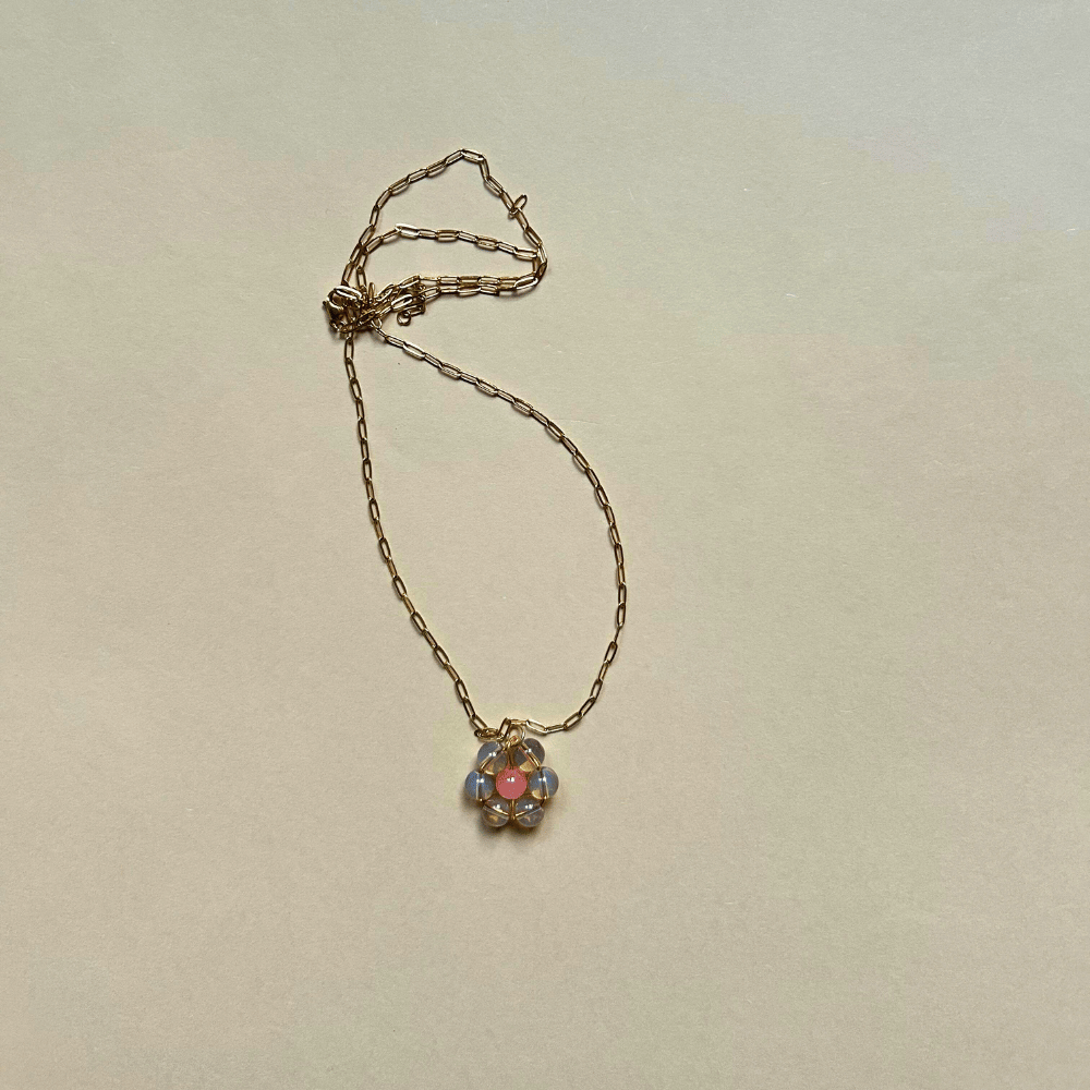 Subtelny, złoty łańcuszek ze stali chirurgicznej, którego serce stanowi ręcznie wykonany kwiatuszek ze szklanych koralików 8 mm. To minimalistyczna, a jednocześnie urokliwa propozycja, która pięknie prezentuje się zarówno noszona solo, jak i jako element warstwowych stylizacji.