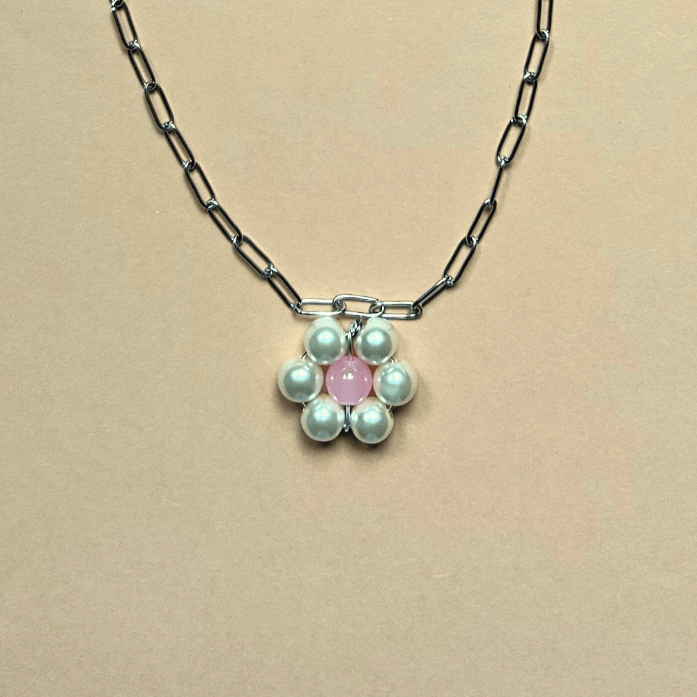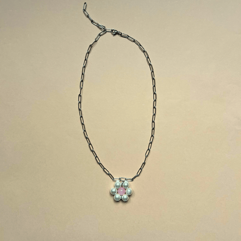 Delikatny łańcuch z drobnymi oczkami wykonany ze stali szlachetnej, ozdobiony ręcznie robionym kwiatkiem ze szklanych perełek 10 mm z uroczym brzoskwiniowym środkiem. To model, który łączy prostotę z unikatowym akcentem, idealny do noszenia solo lub jako dodatek do innych naszyjników.