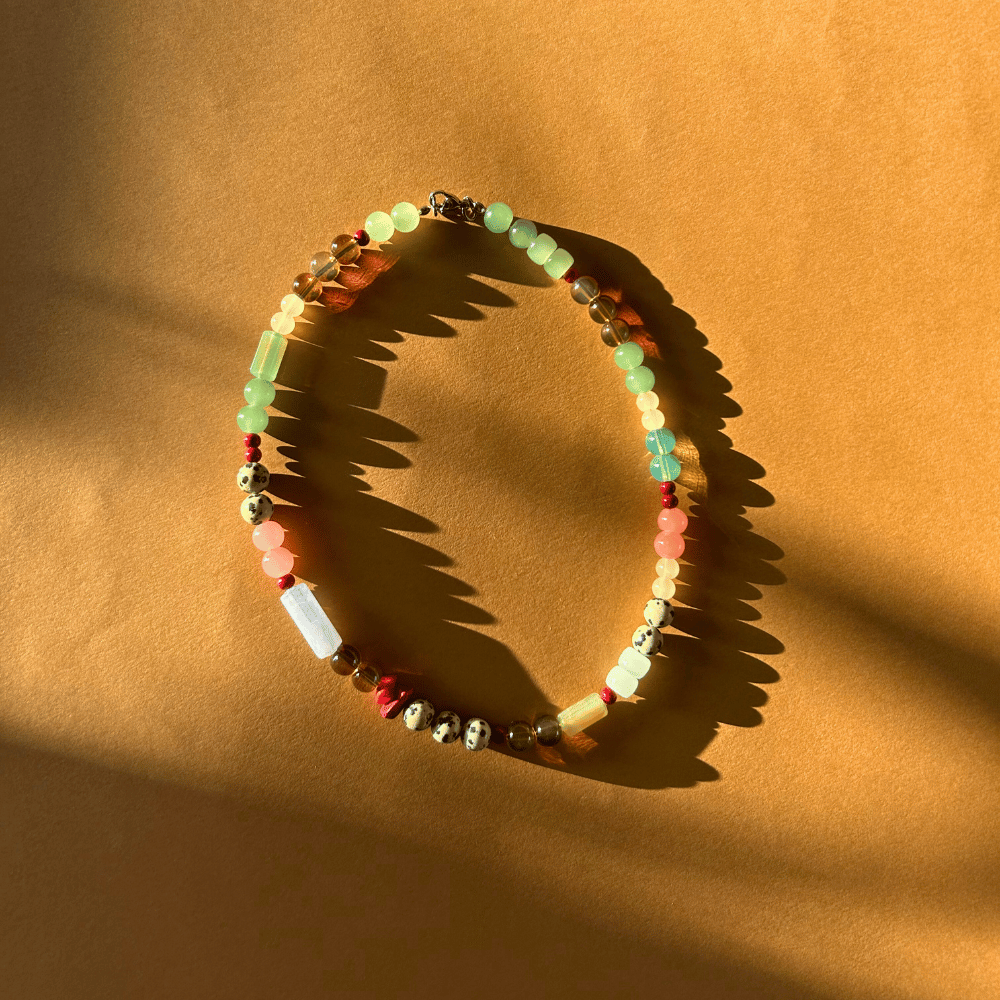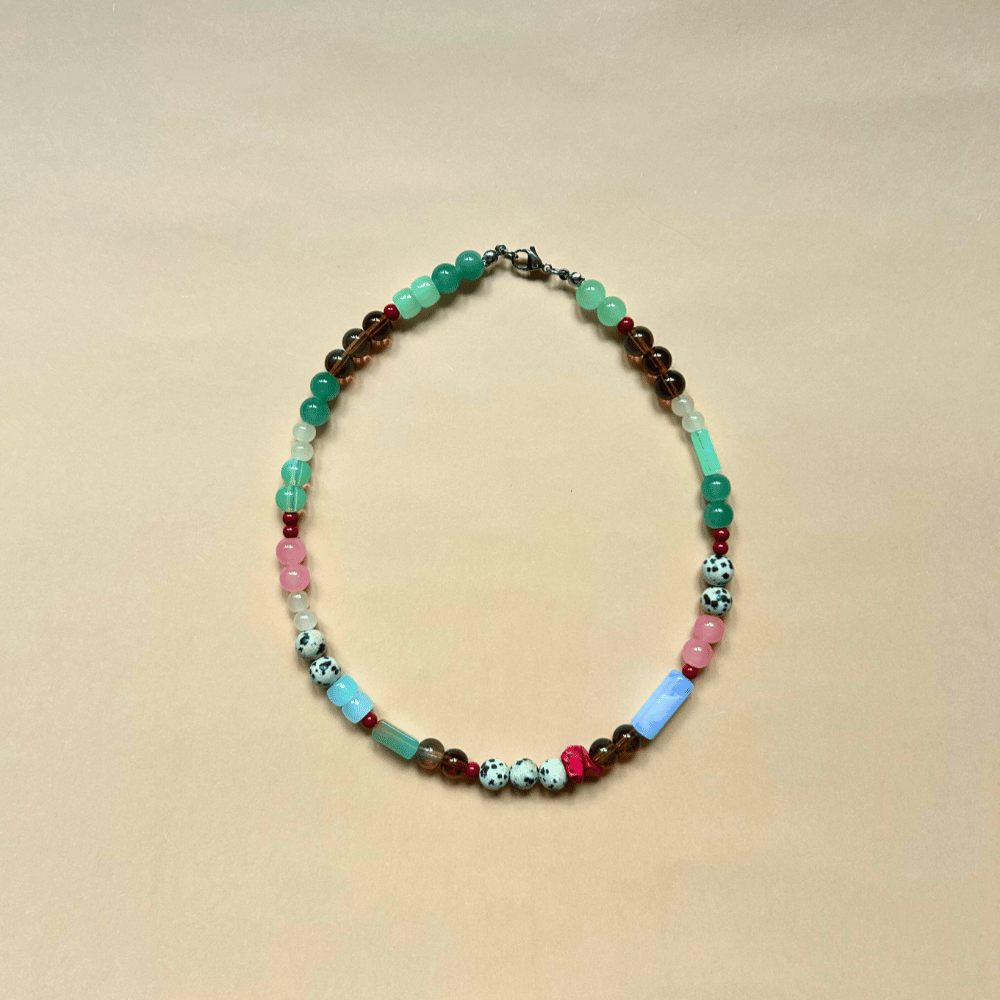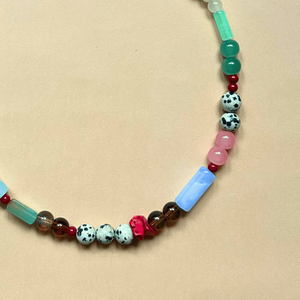 Naszyjnik z kolekcji „Dalmatyńczyk” to wyjątkowe połączenie kontrastów i koloru. Czerwony kamień w centrum pięknie współgra z jaspisem dalmatyńskim oraz szklanymi koralikami w odcieniach zieleni, błękitu i brązu. Całość tworzy harmonijną, a zarazem energetyczną kompozycję — idealną dla osób, które lubią biżuterię z charakterem.