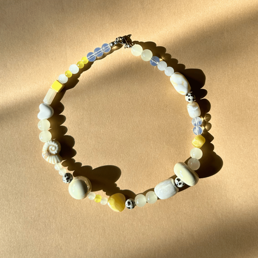 Każdy naszyjnik z kolekcji Niezapominajka to unikatowe, ręcznie tworzone dzieło sztuki. Nie ma dwóch identycznych egzemplarzy – każdy jest wyjątkowy i niepowtarzalny. Połączenie kamieni naturalnych, szkła i ceramiki tworzy harmonijną kompozycję pełną subtelności i charakteru. Całość zwieńcza delikatne zapięcie ze stali chirurgicznej.