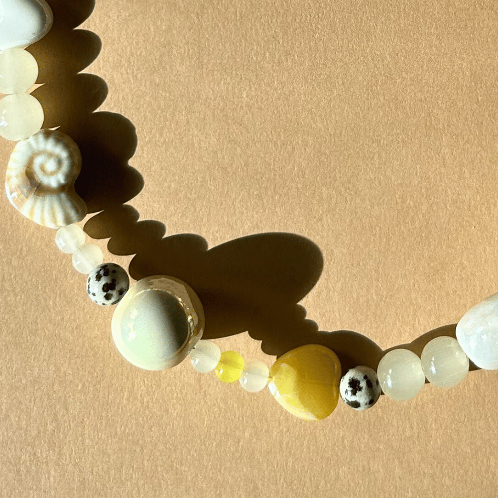 Naszyjnik niezapominajka – ceramika, muszla, jaspis, serce – żółty