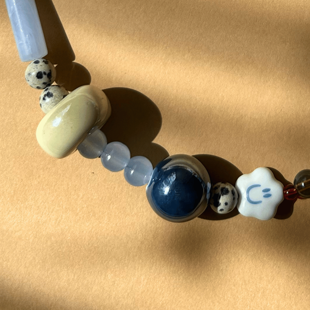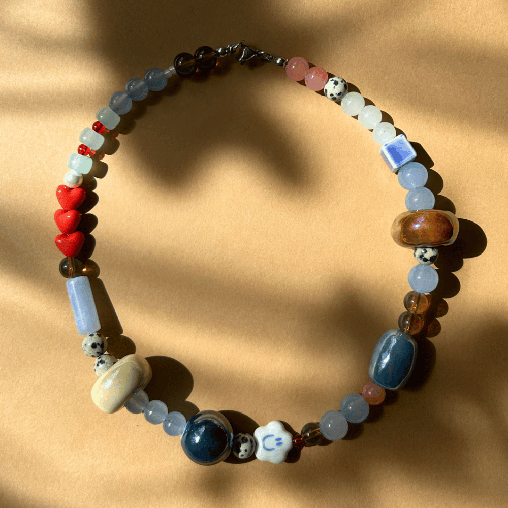 Każdy naszyjnik z kolekcji Niezapominajka to unikatowe, ręcznie tworzone dzieło sztuki. Nie ma dwóch identycznych egzemplarzy – każdy jest wyjątkowy i niepowtarzalny. Połączenie kamieni naturalnych, szkła i ceramiki tworzy harmonijną kompozycję pełną subtelności i charakteru. Całość zwieńcza delikatne zapięcie ze stali chirurgicznej.