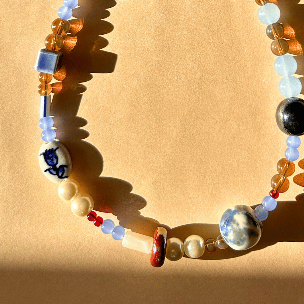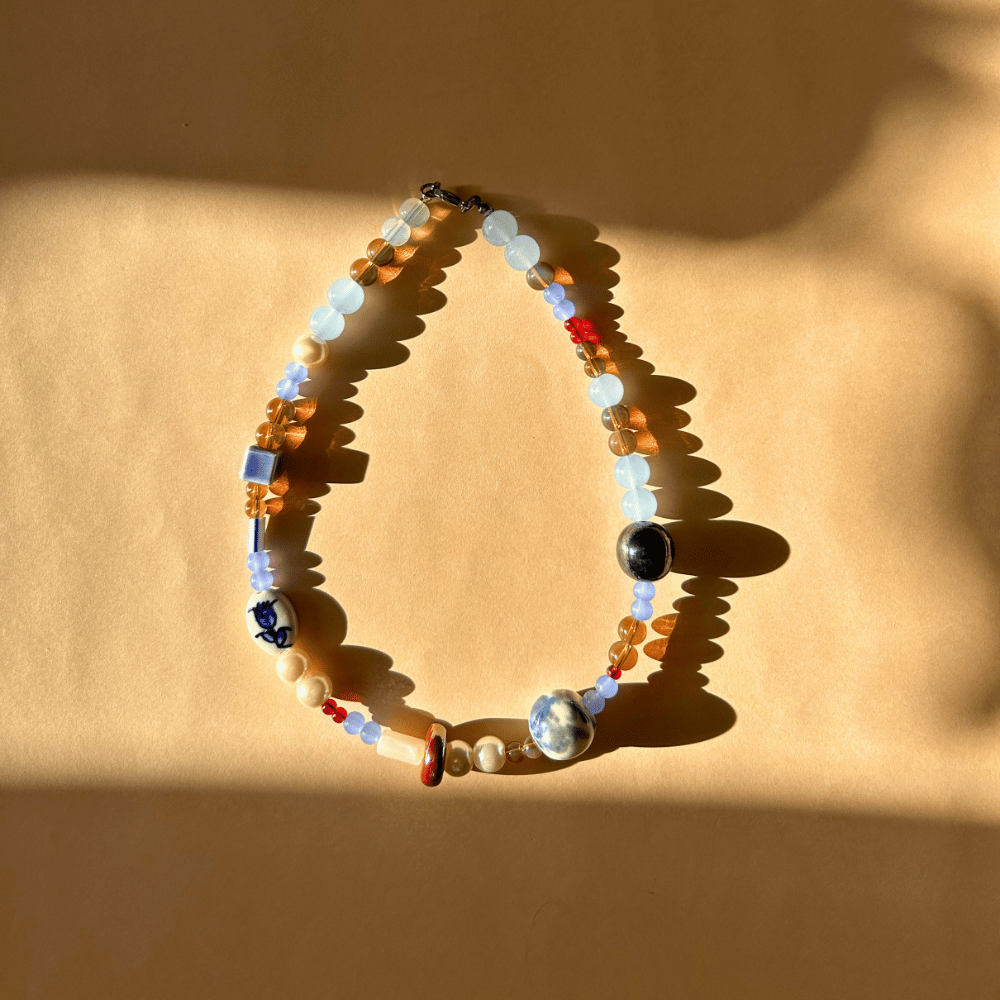 Naszyjnik, który powstał we współpracy z Manzuko, to wyjątkowy projekt z artystyczną duszą. Dziewczyny z Manzuko dały mi wyzwanie — stworzyć biżuterię z elementem ozdobionym ręcznie malowaną różą. Tak powstał ten niezwykły naszyjnik łączący szkło, ceramikę i stal, w harmonijnej palecie niebieskości, bordo i czekoladowych tonów. To połączenie elegancji i subtelnej oryginalności.