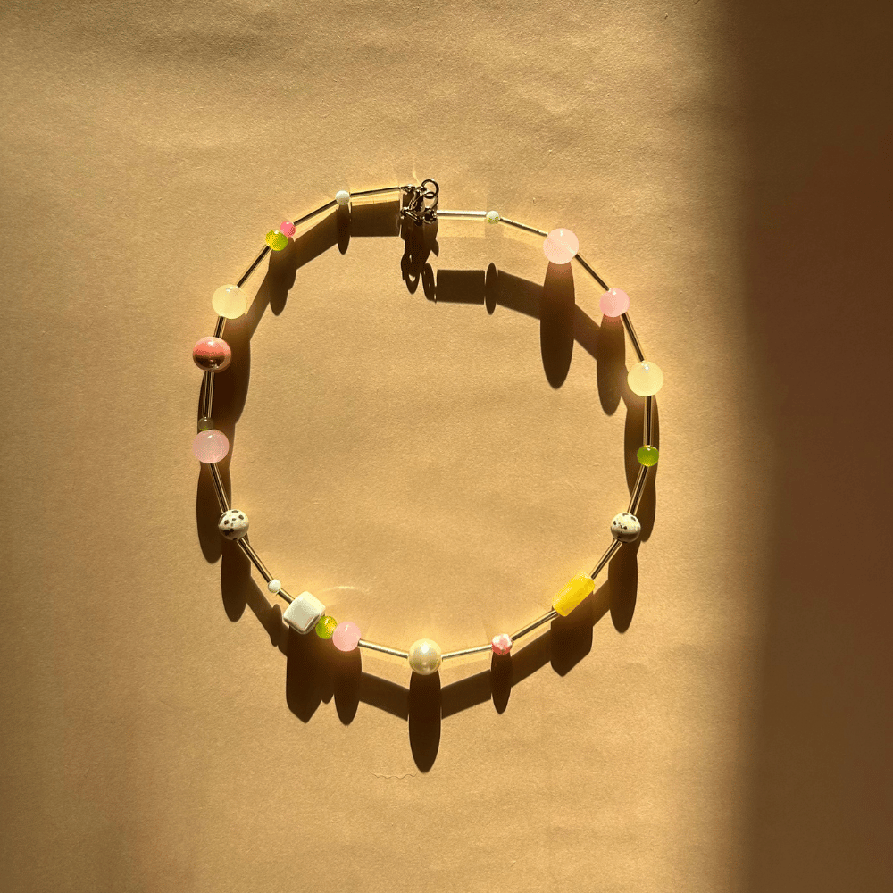 Powstał z mieszanki szkła, ceramiki, kamieni naturalnych i jaspisu dalmatyńskiego, dzięki czemu każdy element ma własny rytm, fakturę i kolor. Szklane słupki nadają mu nowoczesnej lekkości, a pozostałe koraliki wprowadzają ciepło i charakter.