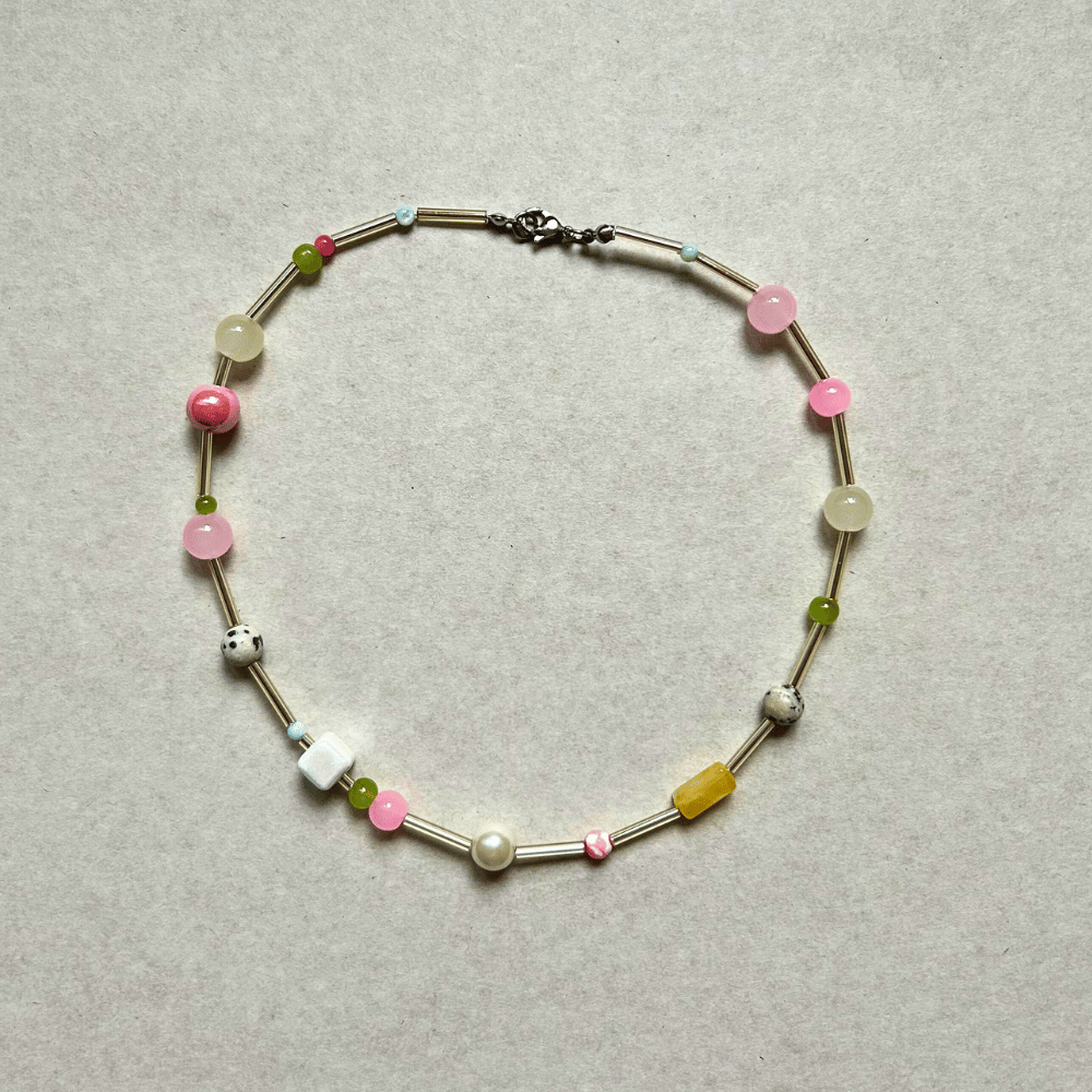 Unikatowy naszyjnik ze szklanych słupków i koralików – jedyny w swoim rodzaju, zrobiony w duchu „raz i nigdy więcej”.