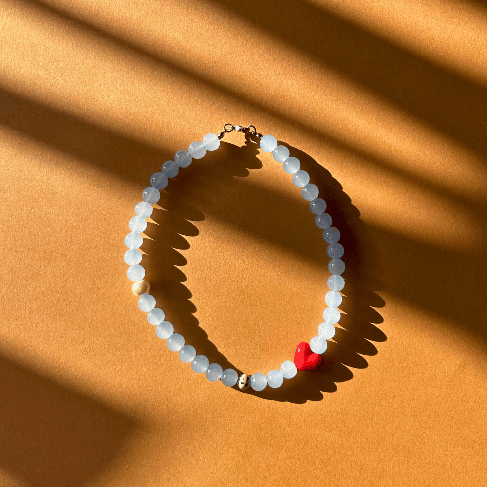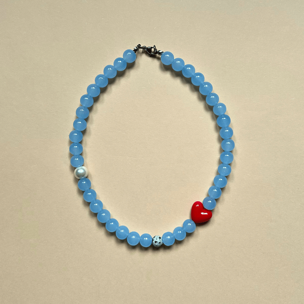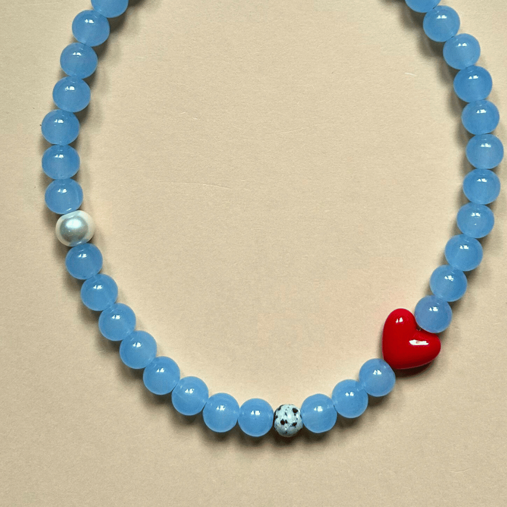 Uroczy, przyciągający wzrok naszyjnik wykonany z dużych, szklanych błękitnych koralików 10 mm, które pięknie odbijają światło. Całość uzupełnia jaspis dalmatyński, ceramiczne czerwone serce oraz szklana perła, tworząc wyjątkową, lekką i charakterystyczną kompozycję.