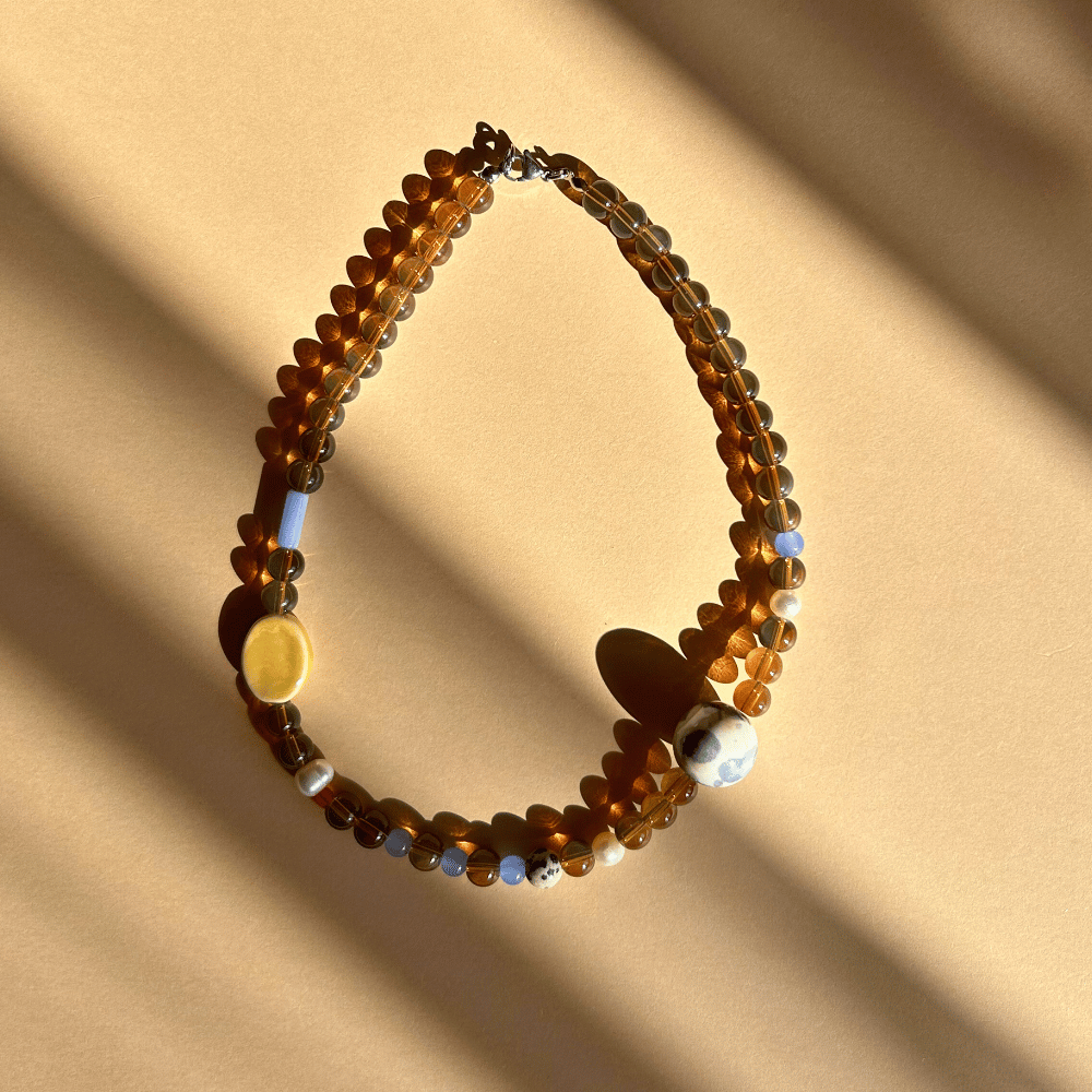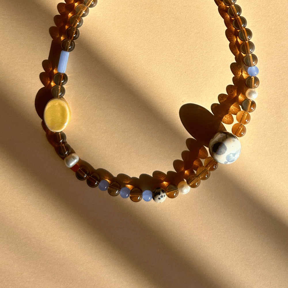 Naszyjnik w ciepłych, ziemistych tonach z błękitnym akcentem to połączenie spokoju natury i subtelnej elegancji. Transparentne, brązowe koraliki pięknie współgrają z błękitną ceramiką i kamieniem jaspisu, tworząc harmonijną, nieoczywistą kompozycję. To wyjątkowy model dla osób, które lubią delikatne, ale charakterne dodatki.