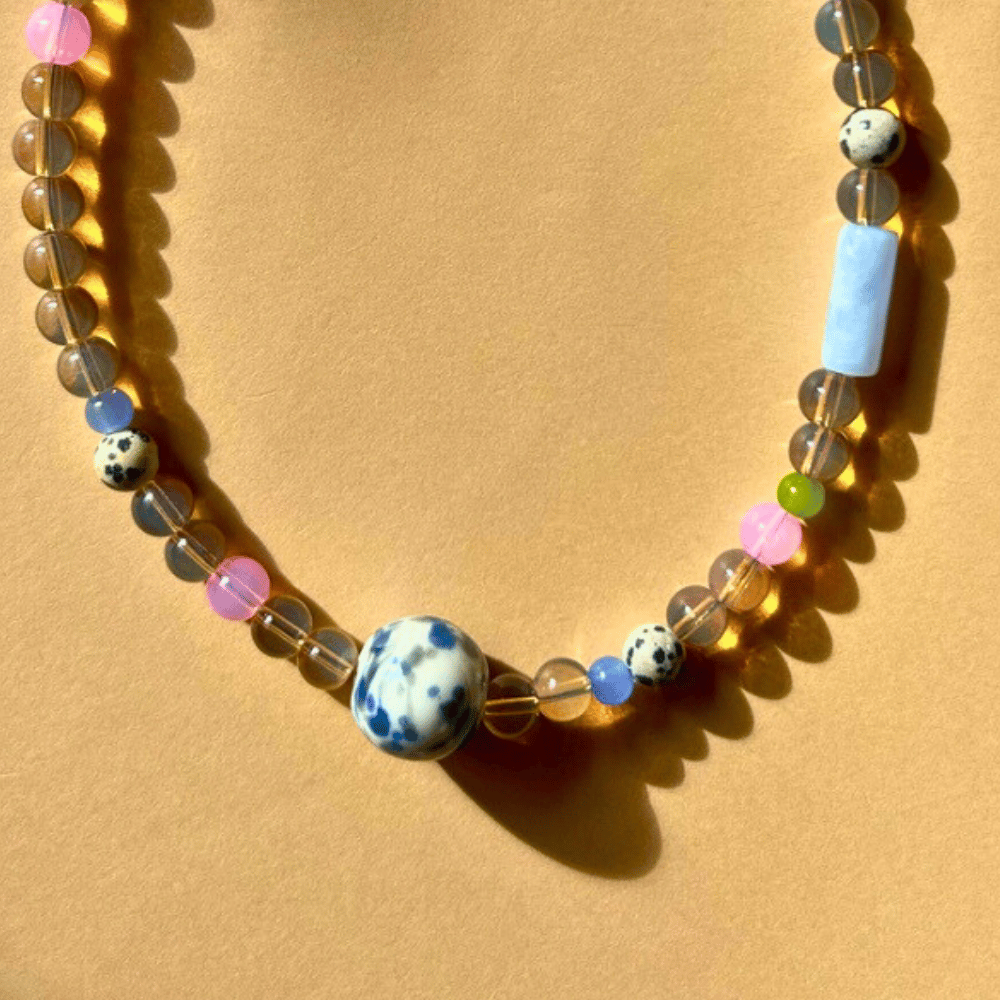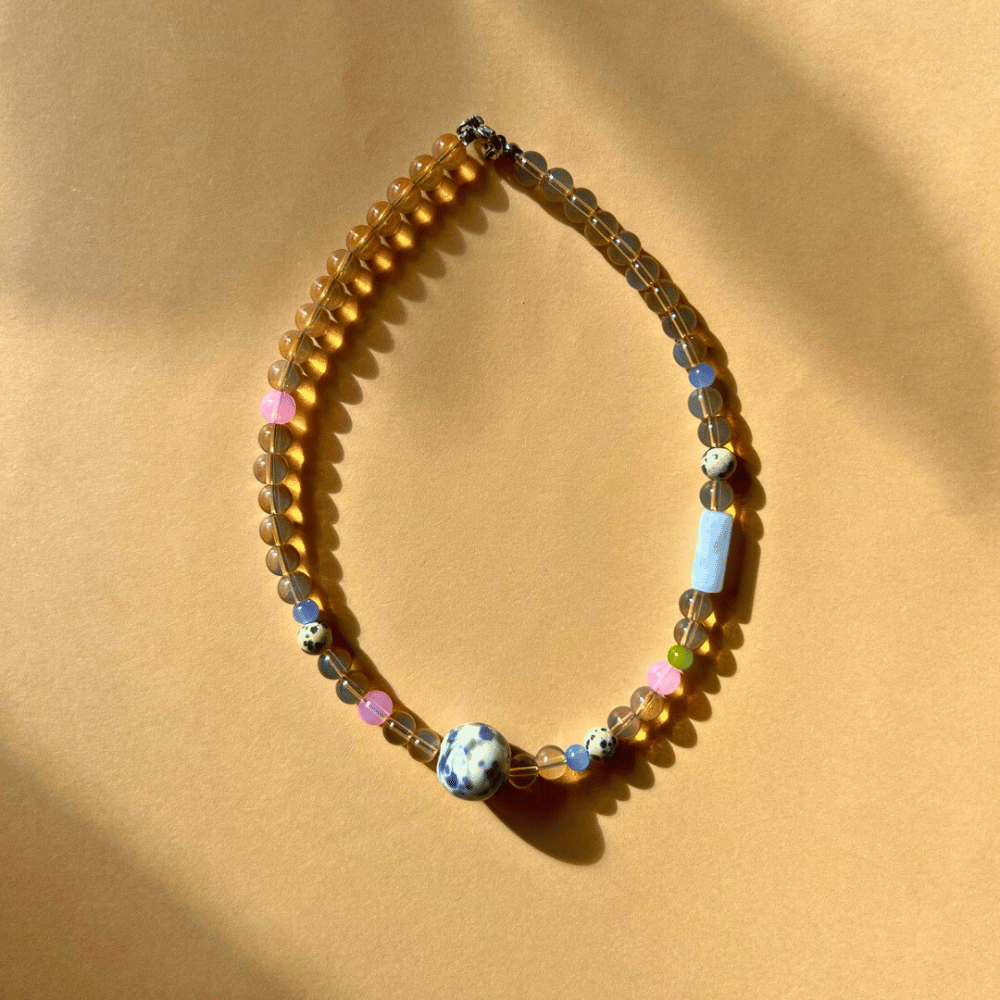 Naszyjnik w ciepłych, ziemistych tonach z błękitnym akcentem to połączenie spokoju natury i subtelnej elegancji. Transparentne, brązowe koraliki pięknie współgrają z błękitną ceramiką i kamieniem jaspisu, tworząc harmonijną, nieoczywistą kompozycję. To wyjątkowy model dla osób, które lubią delikatne, ale charakterne dodatki.