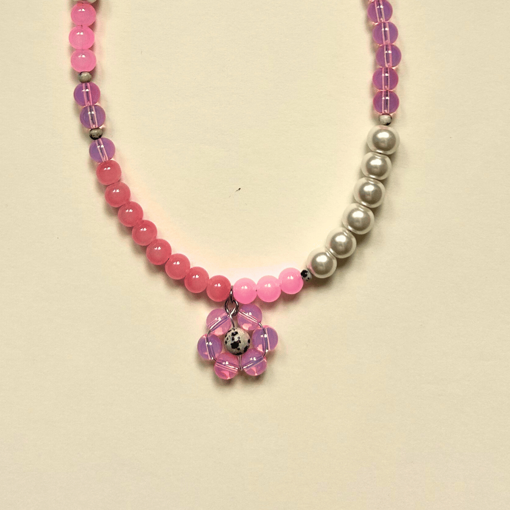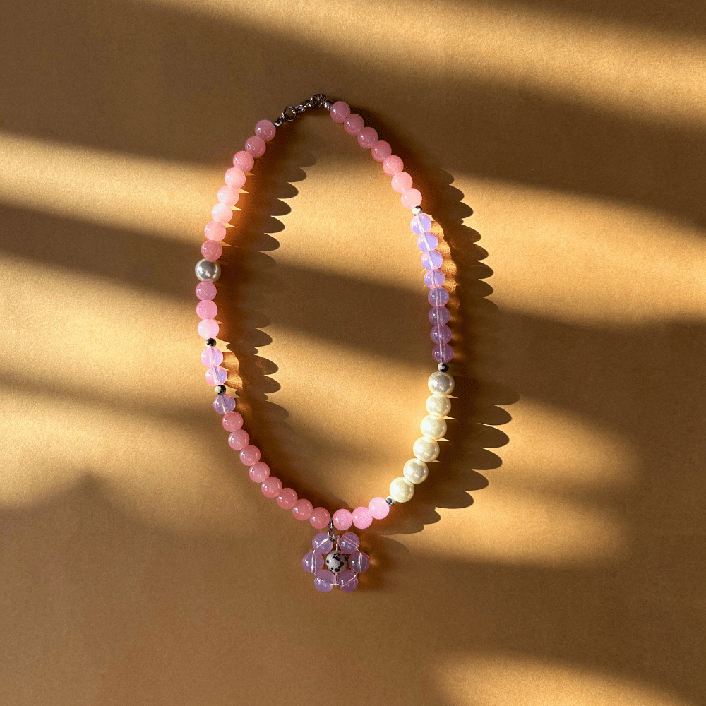Centralnym punktem naszyjnika jest ręcznie pleciony kwiatek, uzupełniony drobnym akcentem jaspisu dalmatyńskiego 4 mm — to detal, który czyni projekt jeszcze bardziej wyjątkowym i niepowtarzalnym.