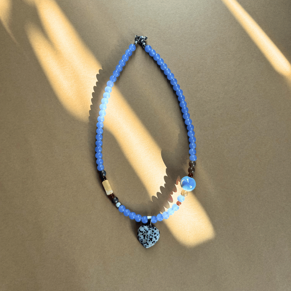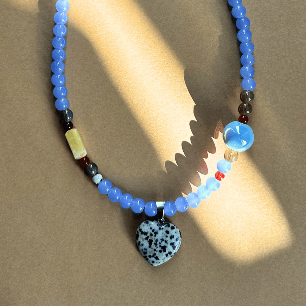 Naszyjnik z niebieskich szklanych koralików (6 mm) z delikatnym akcentem porzeczkowych kulek (4 mm) to połączenie świeżości i subtelnej energii koloru. Całość uzupełnia ceramiczny detal oraz zawieszka w kształcie serca z jaspisu dalmatyńskiego, która dodaje naszyjnikowi naturalnego, niepowtarzalnego charakteru.
