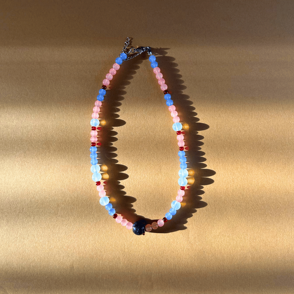 Delikatny, szklany naszyjnik z uroczą szklaną borówką w centralnym punkcie to połączenie subtelności i koloru. Odcienie niebieskiego, różowego i porzeczkowego tworzą lekką, owocową kompozycję, która przyciąga wzrok, ale pozostaje elegancka i pełna wdzięku. To idealny dodatek na co dzień — dziewczęcy, radosny i wyjątkowy.