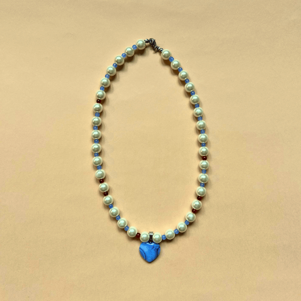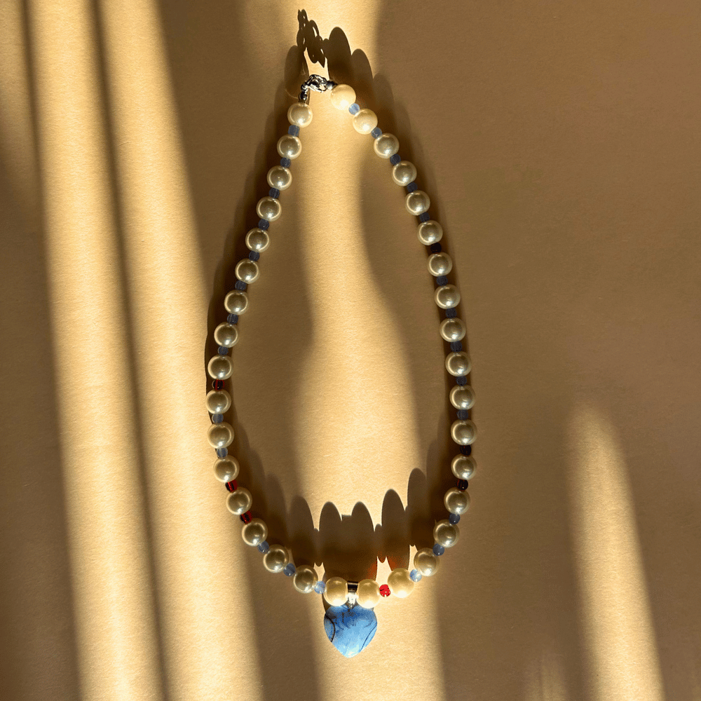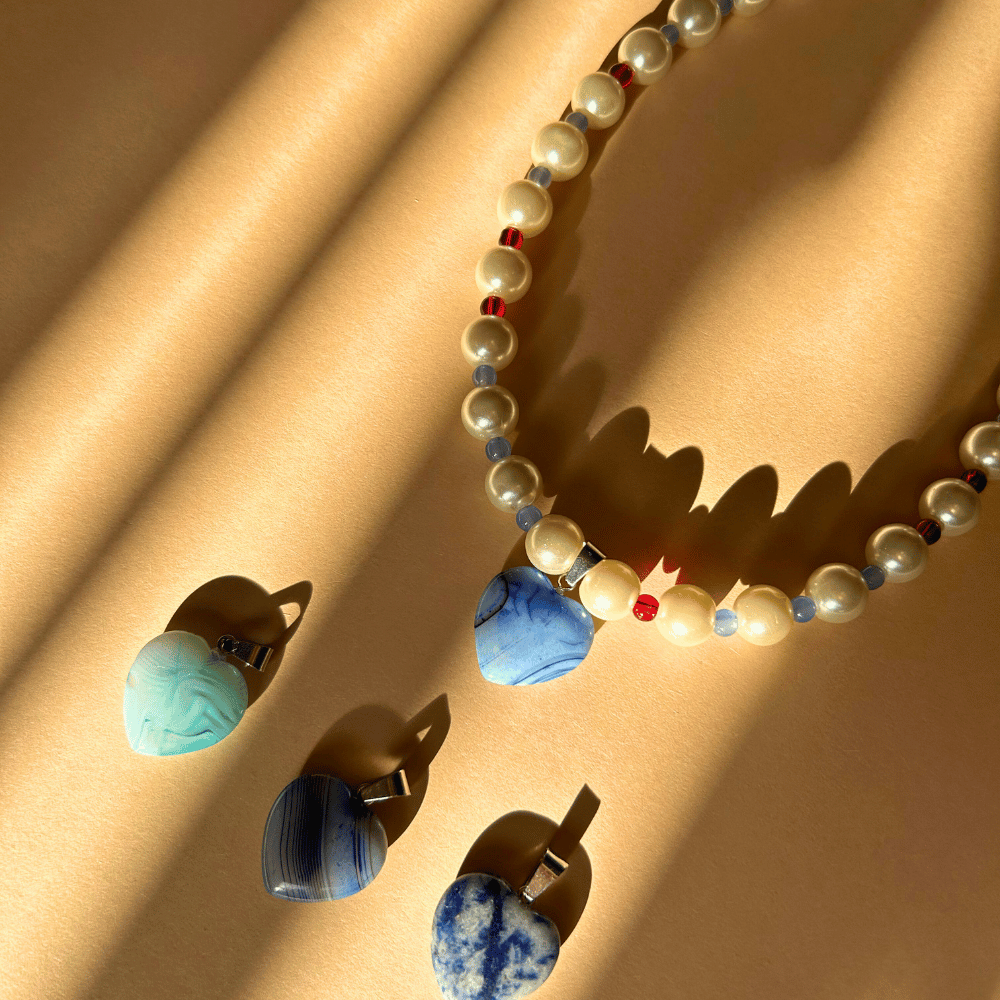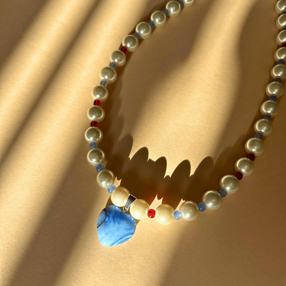 Naszyjnik z niebieskim sercem z agatu to połączenie subtelności i naturalnego charakteru. Naprzemienne szklane perły i niebieskie koraliki tworzą harmonijną całość, a zawieszka w kształcie serca dodaje całości wyjątkowego, lekko artystycznego akcentu. Dla przełamania dodałam koraliki w kolorze jarzębiny. To biżuteria, która podkreśla delikatność, a jednocześnie przyciąga uwagę swoim nieoczywistym zestawieniem materiałów.