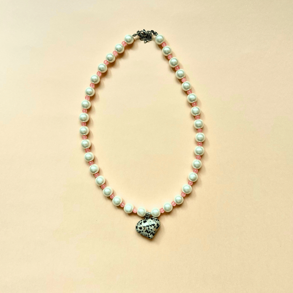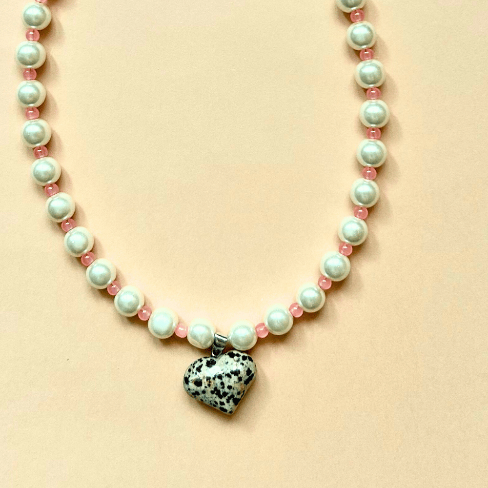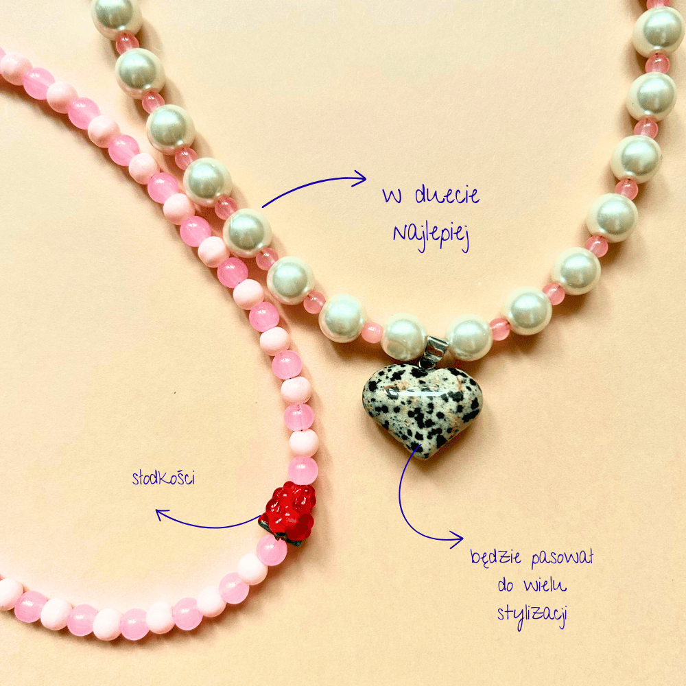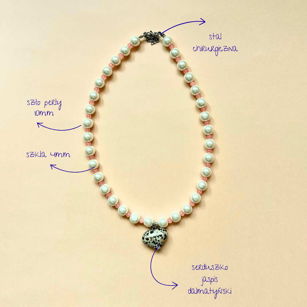 Naszyjnik z sercem z jaspisu dalmatyńskiego to połączenie subtelności i naturalnego charakteru. Naprzemienne szklane perły i różowe koraliki tworzą harmonijną całość, a zawieszka w kształcie serca dodaje całości wyjątkowego, lekko artystycznego akcentu. To biżuteria, która podkreśla delikatność, a jednocześnie przyciąga uwagę swoim nieoczywistym zestawieniem materiałów.