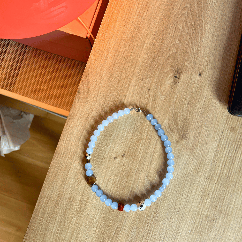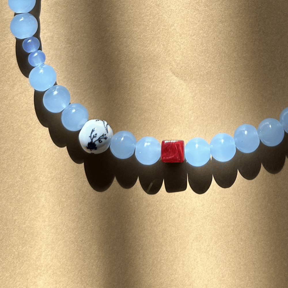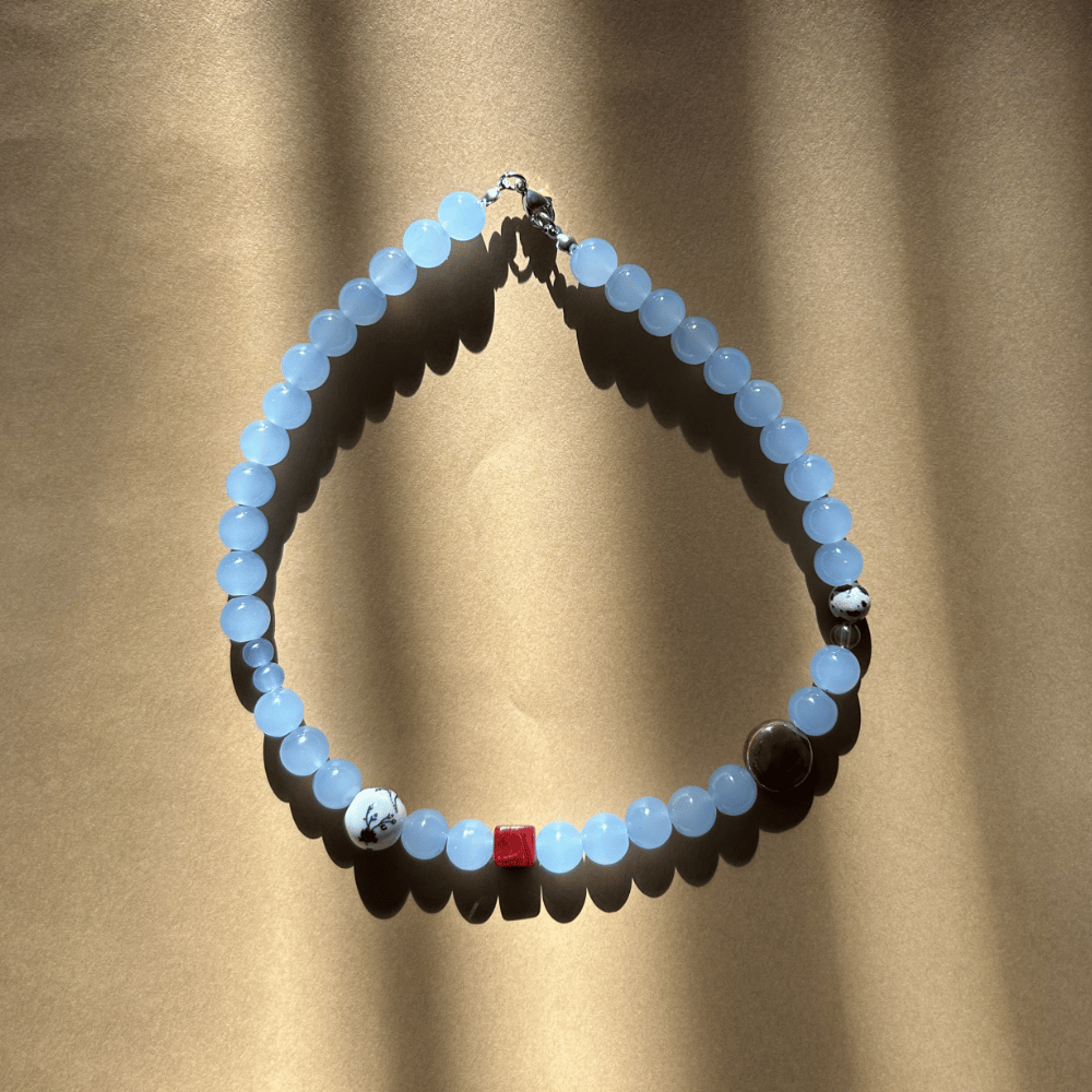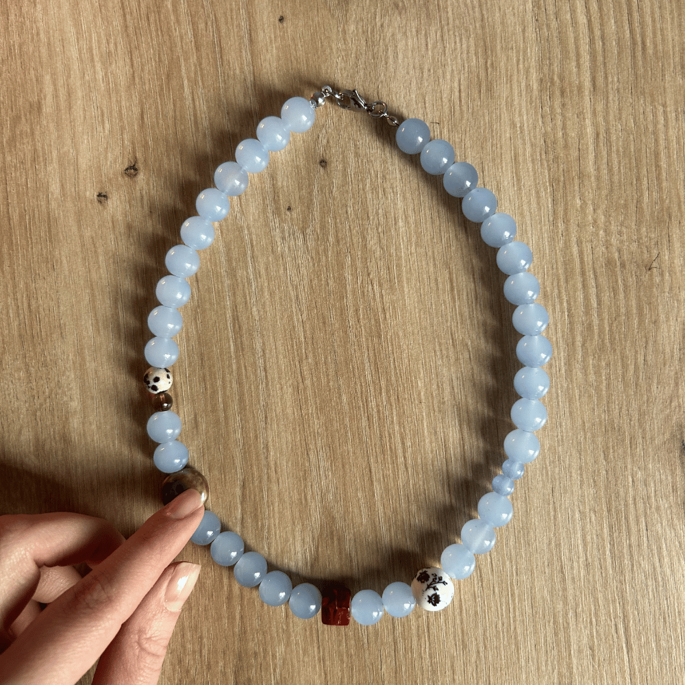 Subtelny, ale wyrazisty naszyjnik wykonany z błękitnych szklanych koralików 10 mm, uzupełnionych detalami z jaspisu, porcelany oraz ceramiki. To połączenie faktur i materiałów nadaje całości lekko artystycznego charakteru — delikatny błękit przełamany naturalnym akcentem kamienia i szlachetnością porcelany tworzy bardzo harmonijną kompozycję.