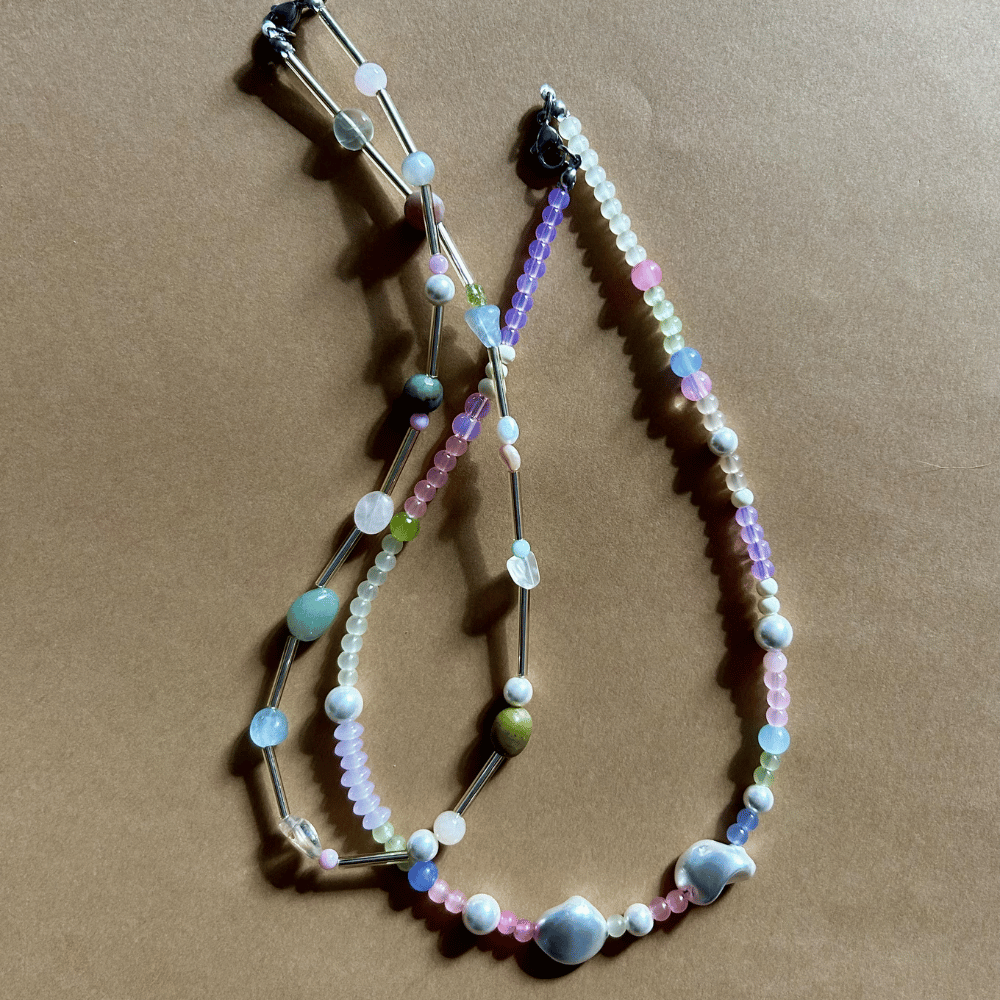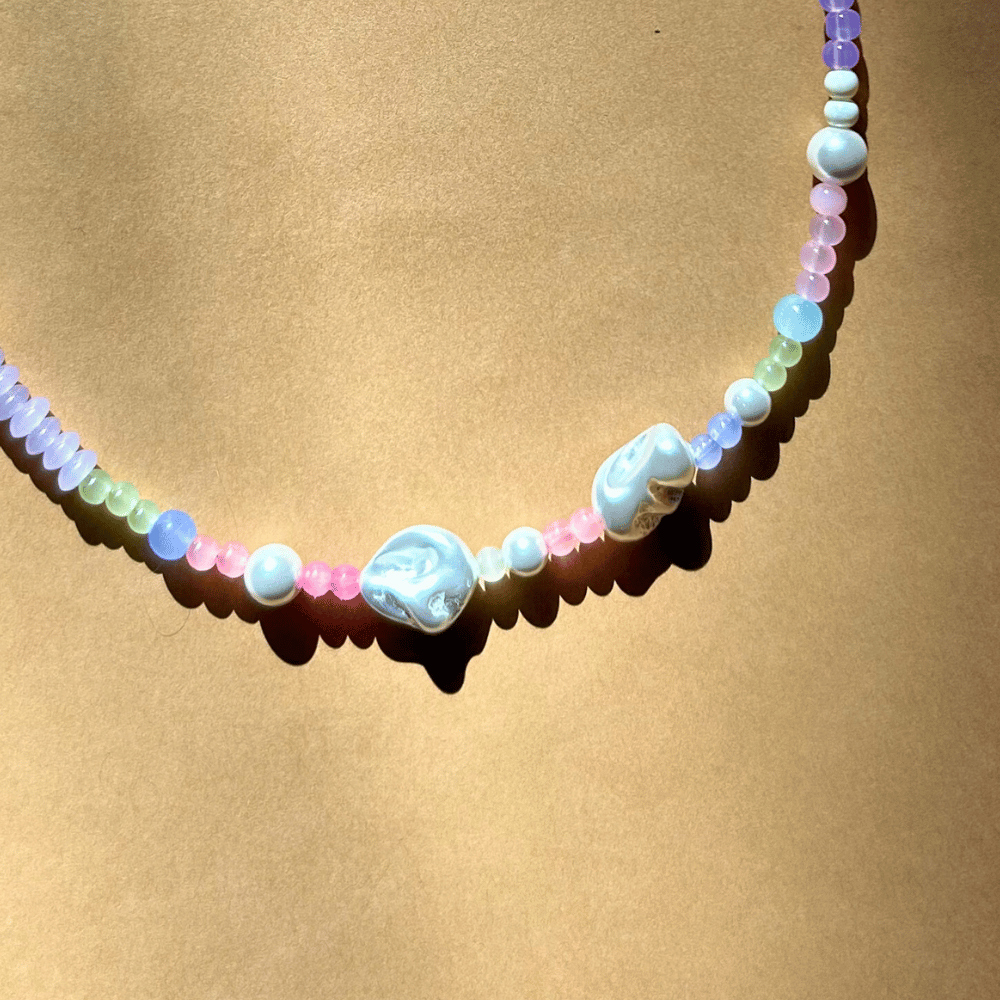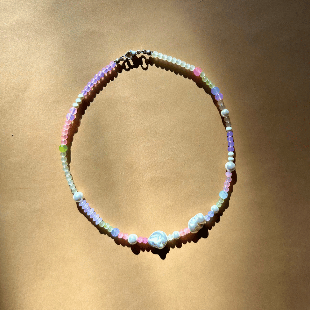 Pastelowe kolory sprawiają, że model jest świeży, kobiecy i bardzo uniwersalny — idealny do codziennych stylizacji, lnianych koszul, basicowych topów czy letnich sukienek. Świetnie wygląda solo, ale równie dobrze łączy się z inną biżuterią w warstwowych zestawieniach.