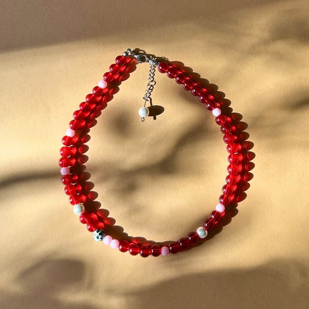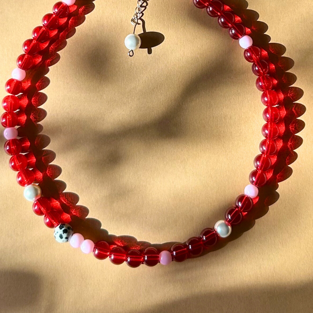 Wyrazisty, kobiecy model zbudowany na bazie czerwonych, półtransparentnych szklanych koralików 8 mm, które pięknie łapią światło i nadają całości głębi. Kompozycję uzupełniają perły seashell 8 mm oraz jaspis dalmatyński 8 mm, przełamujące intensywną czerwień subtelnym kontrastem.