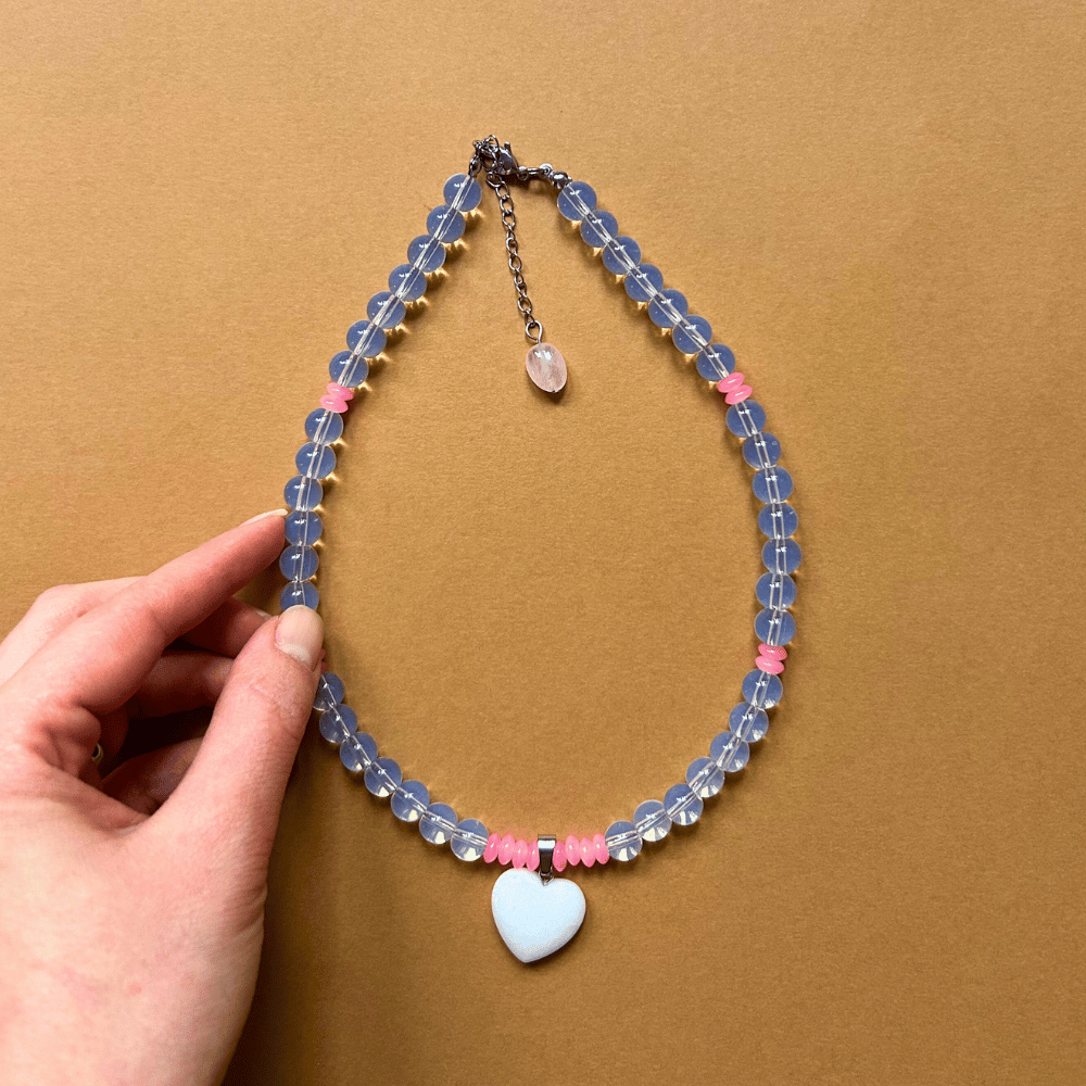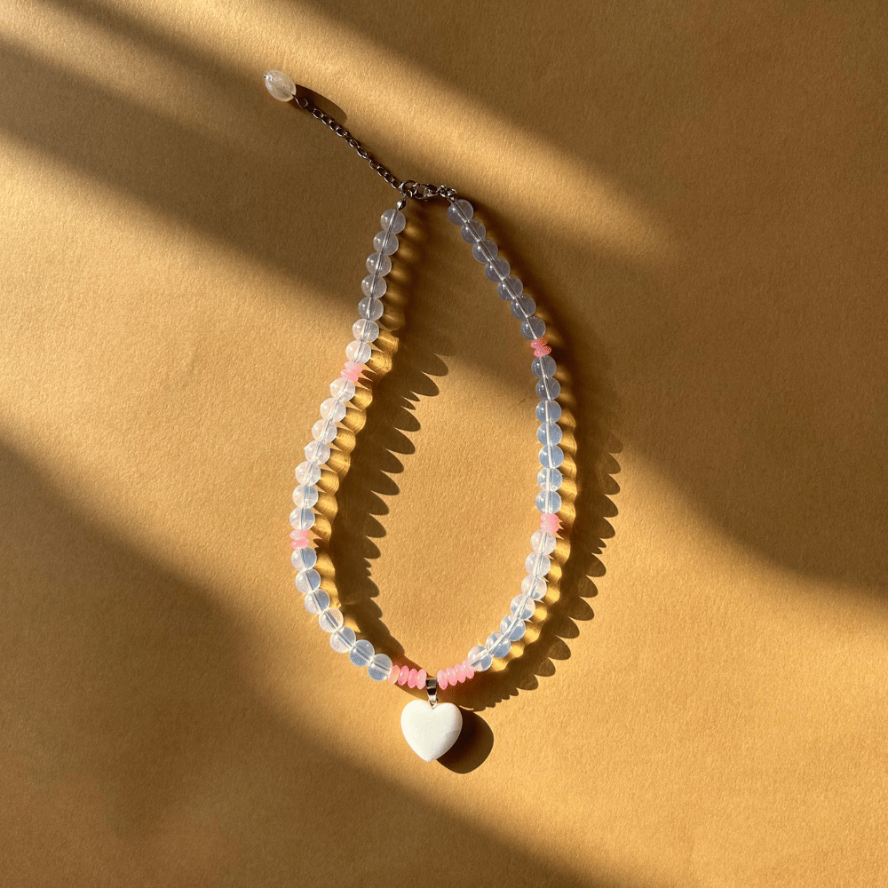 Naszyjnik ze szklanych koralików z sercem z białego jadeitu i przedłużką z kwarcu różowego