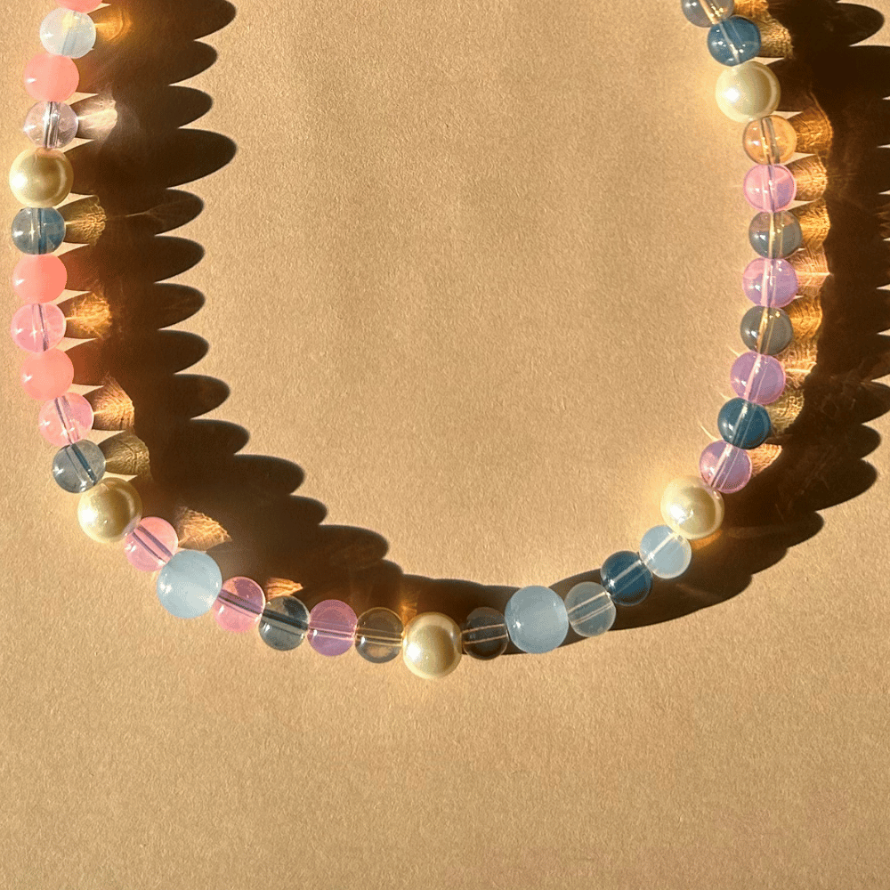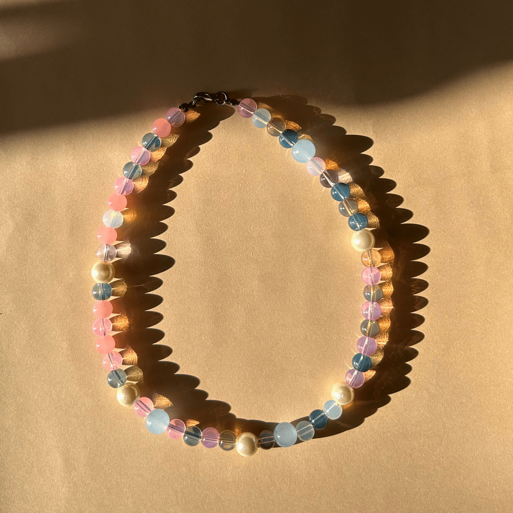 Delikatny naszyjnik z półtransparentnych szklanych kulek (8 mm), które pięknie odbijają światło, tworząc subtelny efekt blasku przy każdym ruchu. Całość dopełniają szklane perły (10 mm), dodające elegancji i klasycznego uroku. To minimalistyczny, ale wyrazisty dodatek, który pasuje do wielu stylizacji.